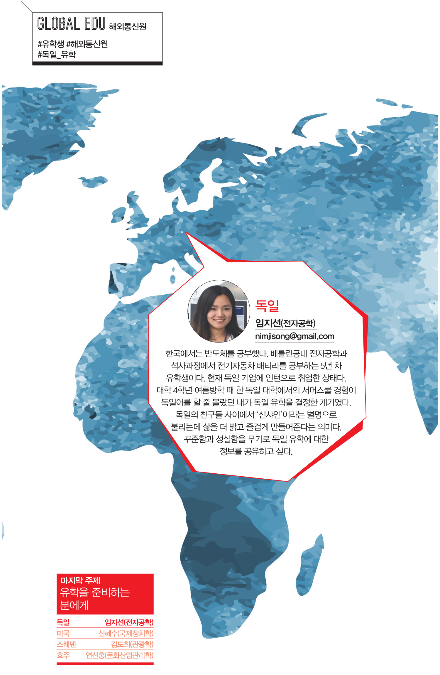 독일, 미국, 중국, 스웨덴에서 전자공학, 국제정치학, 문화산업관리학, 관광학을 전공하는 4기 해외통신원들의 생생한 경험담이 시작됩니다. 중학생 때 유학길에 오른 통신원부터 특성화고 졸업 후 유학, 대학 졸업 후 유학 등 다양한 경험의 통신원들까지! 이들의 파란만장 유학 생활을 리얼하게 전해드립니다. _편집자