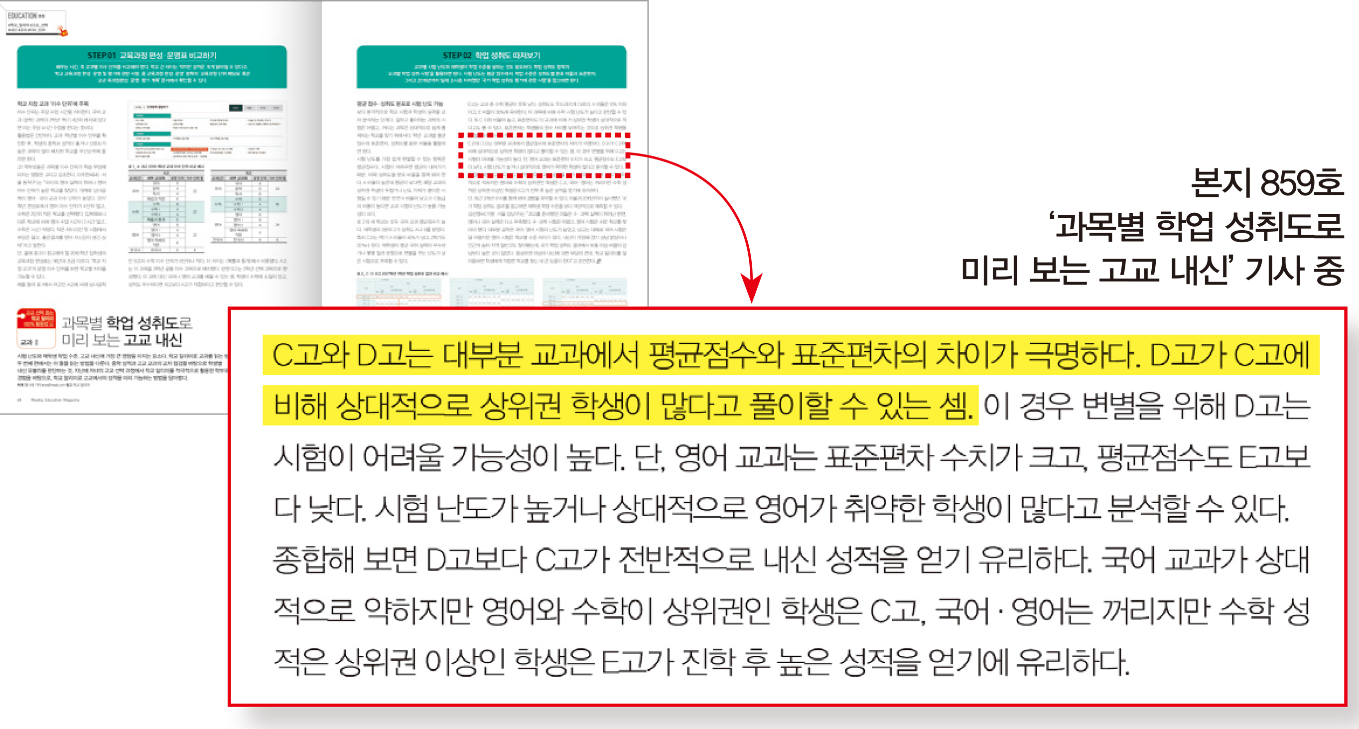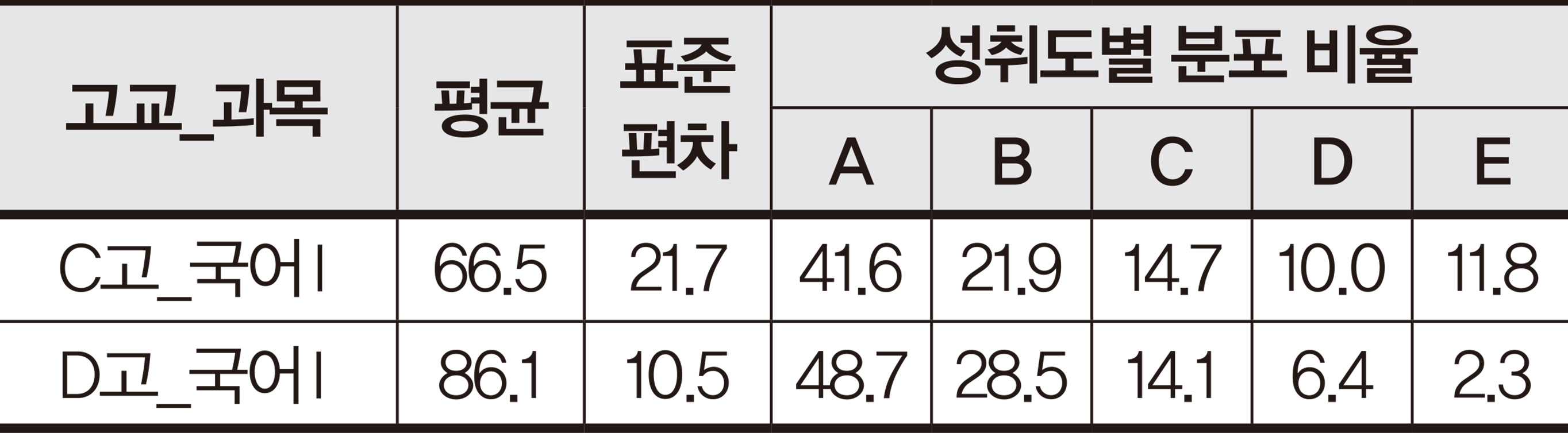 C고의 <국어Ⅰ> 과목을 먼저 살펴보겠습니다. 이 과목의 평균점수가 D고보다 낮다는 것은 시험에서 낮은 점수를 받은 학생들이 더 많다는 것을 의미합니다. 반면 표준편차는 D고보다 크네요. ‘흩어짐의 정도’가 더 크다는 뜻입니다. 즉 학생들마다 받은 점수가 더 넓게 펼쳐져 있다는 의미입니다.