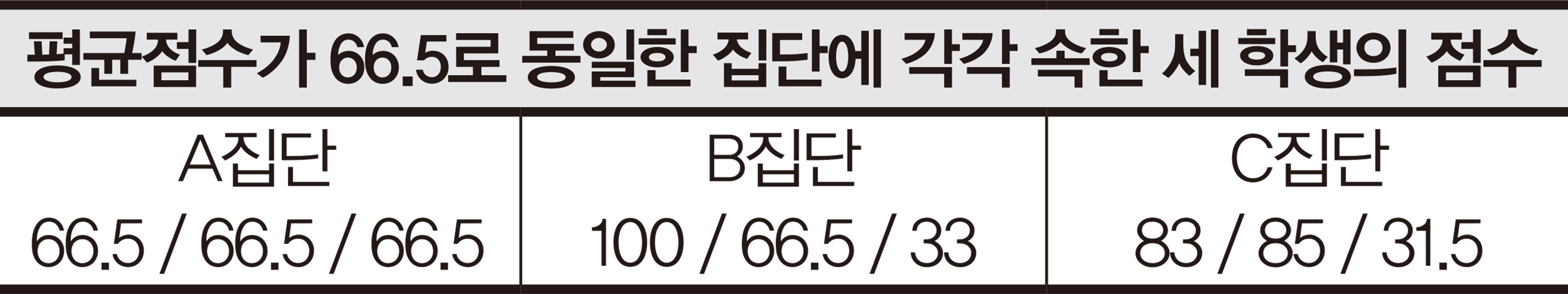 예시를 통해 좀 더 자세히 이해해볼까요? 평균점수가 동일하게 66.5인 A~C집단에 속한 세 학생이 각각 받은 점수입니다.