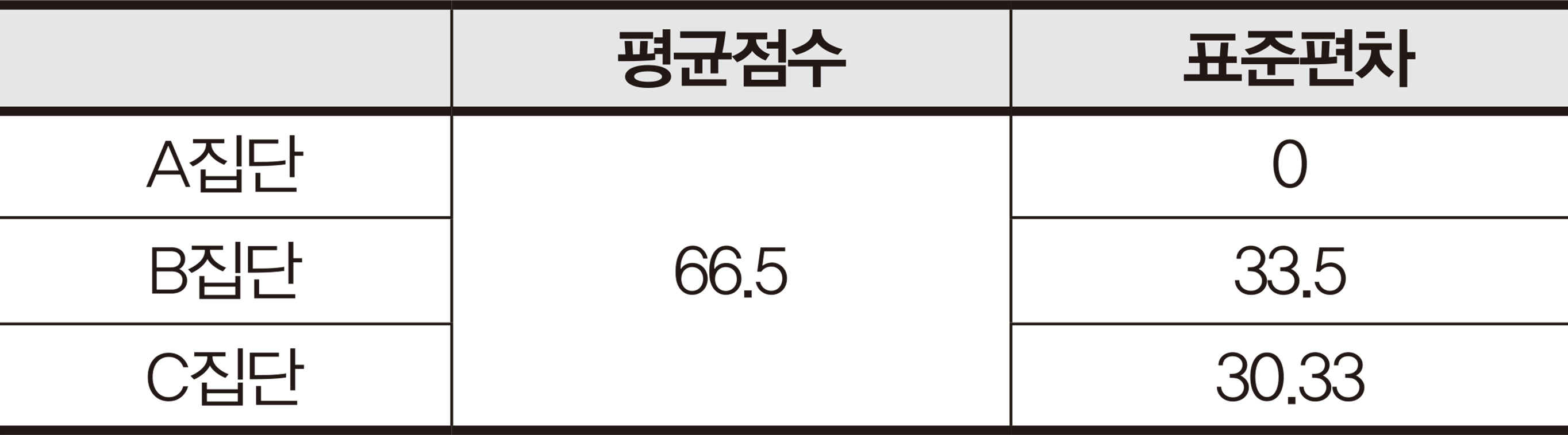 집단별 평균점수는 66.5점으로 같지만, 집단마다 속한 세 학생의 점수는 모두 다릅니다. 따라서 이 학생들의 ‘흩어짐의 정도’, 즉 표준편차는 모두 다릅니다.