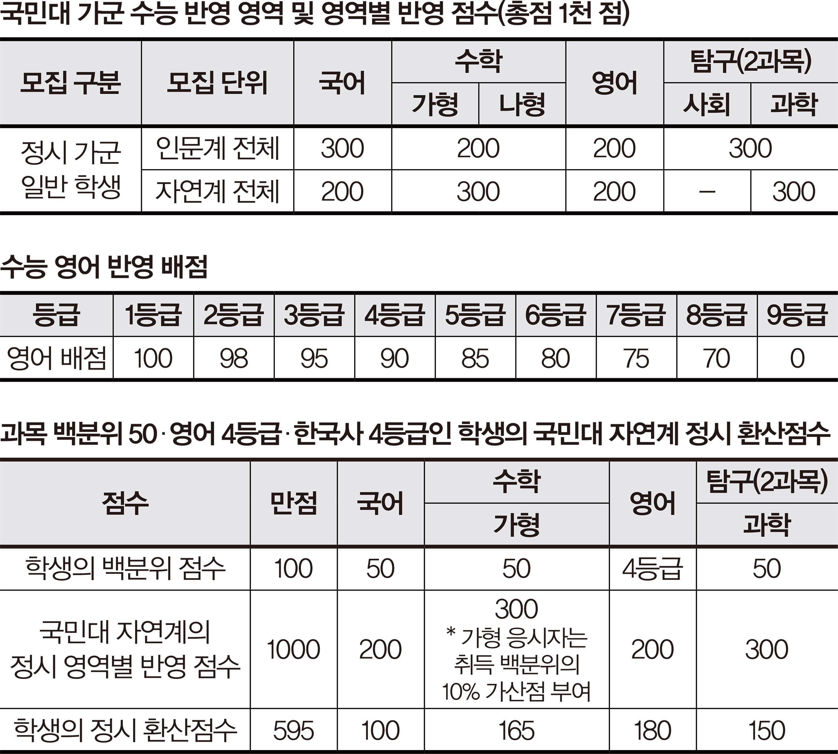 형광색으로 표시된 부분을 좀 더 설명해볼까요? 백분위가 50인 학생에게 가산점 10%를 주면 55점이 된다는 건 쉽게 이해될 겁니다. “수학 반영 비율을 적용한다 해도 전체 상승 점수는 7~8점 정도에 그친다”라는 부분을 좀 더 알아보겠습니다.정시에서는 국어·수학·영어·탐구의 반영 비율이 대학마다, 혹은 모집 단위마다 다릅니다. 인문계는 국어와 탐구, 자연계는 수학과 과학탐구의 반영 비율이 높은 편입니다. 기사에서 예로 나온 국민대의 정시 성적 계산법을 살펴봅시다.