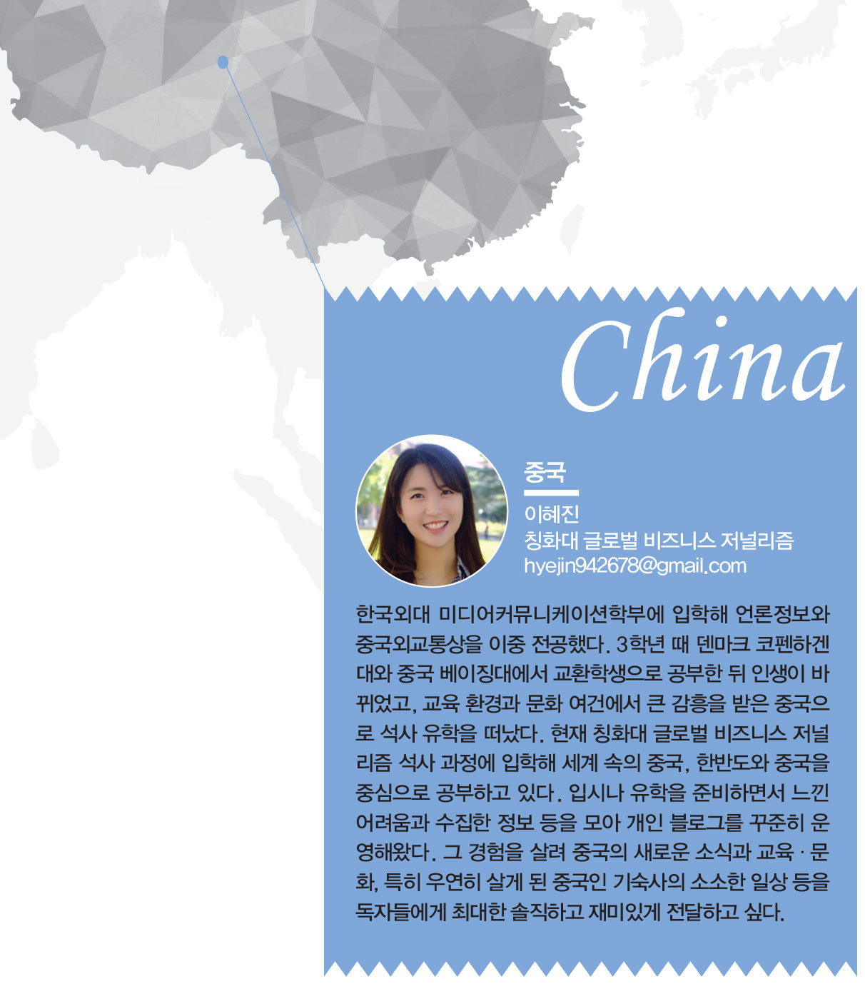 하지만 분명한 것은 아직까지 우리나라는 중국 현지에서 오랫동안 중국에 대해 깊이 있는 연구를 진행한 연구자가 부족한 상황이라는 것. 때문에 중국은 공부를 이어가면서 자신의 관심을 성과로 이어나가기 좋은 환경을 갖춘 나라다.