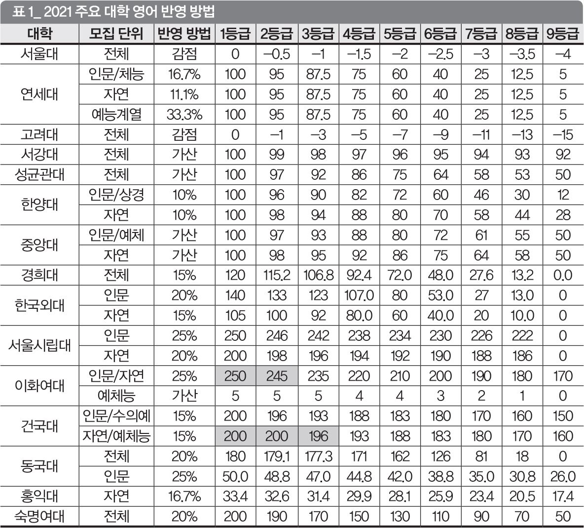 수능 영어 영역은 절대평가와 낮은 반영 비율로 인해 타 영역에 비해 영향력이 작은 편이 다. 대부분의 대학은 대학별 환산점수 산출 시영어도 영역별 가중치를 정해 일정 비율로 반영하지만 서울교대와 고신대 의예과처럼 최저 학력 기준으로 활용하는 대학도 있다. 서강대 성균관대 중앙대 등은 등급별 점수를 가산 하고, 고려대와 서울대 등은 감산하는 방식을 사용한다(표 1).