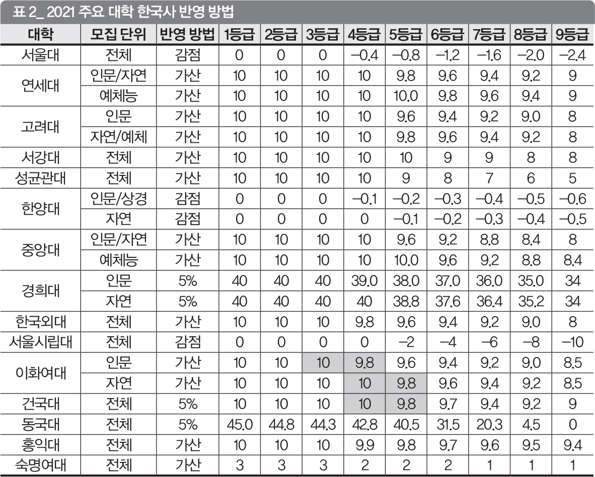 한국사는 영어에 비해 반영되는 점수 차가 매우 적다. 대부분의 대학들이 4 등급까지 만점으로 처리하고 고려대 경희대 한양대 이화여대 인문 계열은 3 등급까지 만점으로 본다(표 2).