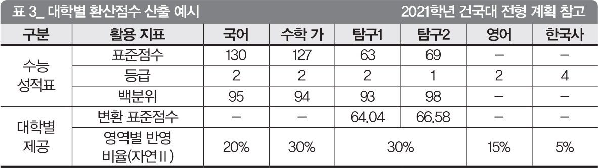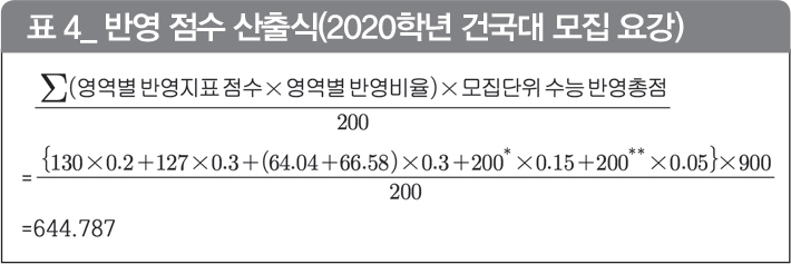 가상의 수능 성적(표 3)으로 2021학년 건국대 전형 계획을 참고해 자연 계열Ⅱ의 환산점수를 계산해봤다(표 4).(→본지 934호 위클리 테마 ‘대 학별 환산식의 세계’ 기사 참고)