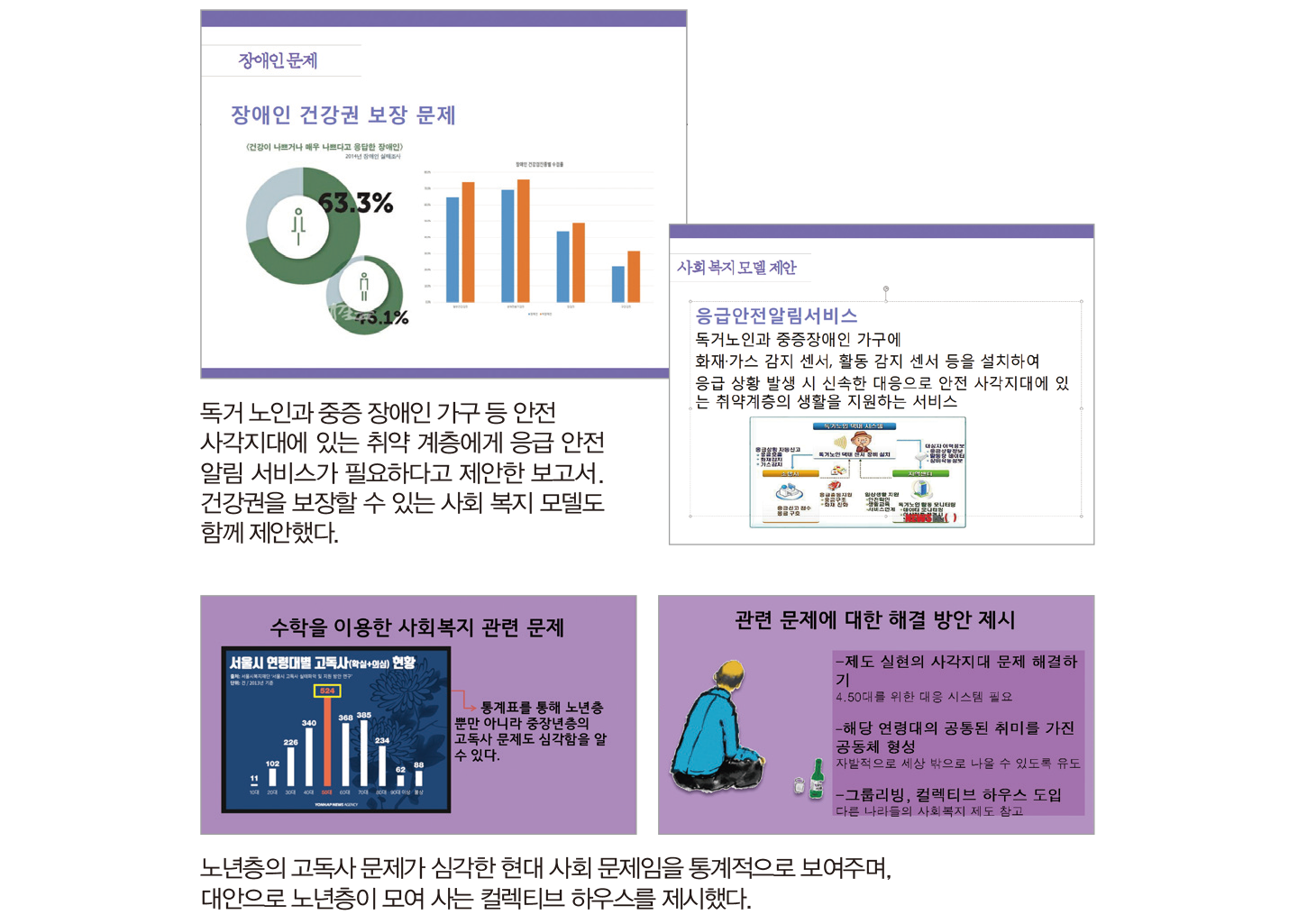 “독거 노인과 중증 장애인의 고독사에 관심을 가지면서 각 가정에 화재, 가스 감지 센서, 활동 감지 센서 등의 설치가 필요하다고 제안했어요. 그들에게 이상 행동이 포착되면 바로 소방서나 지역 센터로 전달되는 시스템이에요. 정책적으로 이런 시스템이 자리를 잡는다면, 증가하는 고독사 문제를 해결하는 데 도움이 될 거라 생각해요.”