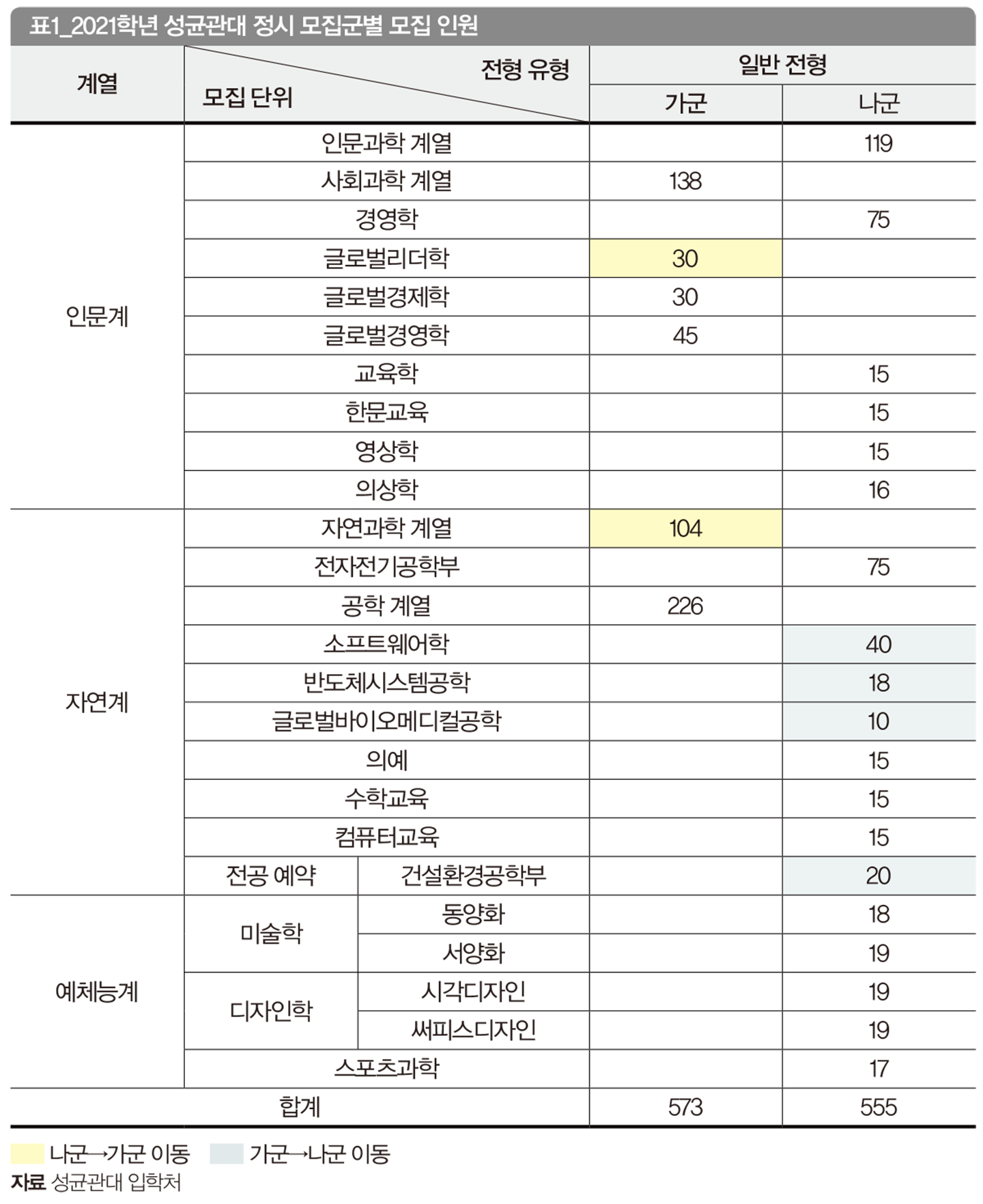 2021학년 성균관대는 일부 모집 단위에 대한 정시 모집군을 변경했다(표 1). 대표적인 특성화 학과인 반도체시스템공학 전공을 비롯해 글로벌바이오메디컬공학, 소프트웨어학 등을 기존 가군에서 나군으로 이동 했고 글로벌리더학 등을 나군에서 가군으로 이동했다. 성균관대가 반도체시스템공학을 비롯해 자신 있어하는 세 전공을 나군으로 옮긴 이유도 네임 밸류와 선호도 등에 대한 자신감 상승으로 해석할 수 있다.