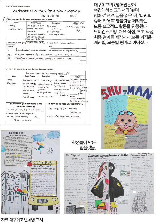 수업 내용과 평가 방법 역시 다채롭다. 예를 들면 교과서의 ‘푸드 트럭’ 관련 글을 읽고 수업을 진행한 뒤, 모둠별로 구상한 푸드 트럭을 주제로 영어 상황극을 공연하는 식이다. 말하기 평가는 공연 과정에서 자연스럽게 이뤄진다. 쓰기 평가는 교과서의 ‘슈퍼 히어로’ 관련 글을 읽고 문화적 측면에서 슈퍼히어로를 분석한 뒤, 모둠별로 자신만의 슈퍼 히어로를 만들어 영어로 소개하는 팸플릿 제작 활동으로 진행했다. 교실 안에서 진행하는 수업이긴 하지만, 단순히 이론에 머무르지 않고 현지의 문화를 학생들이 직접 체험하고 느끼게 하는 데 중점을 둔 것이 특징이다.
