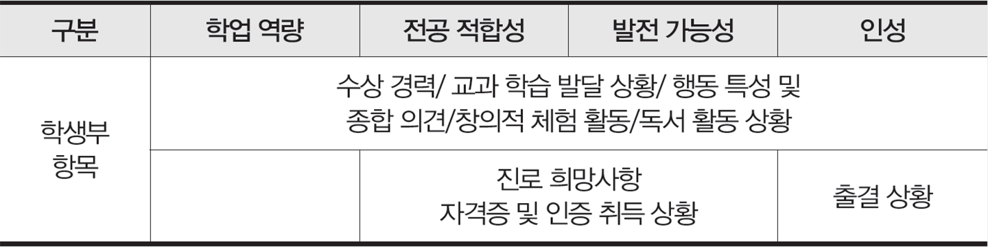 평가 요소와 학생부 항목 연계는? 각 평가 요소에 해당하는 학생부 항목을 연결해 살펴보는 것도 필요하다. 예를 들어 대학은 학생부의 ‘진로 희망사항’ 내용을 통해 지원자의 전공 전합성과 발전 가능성을 평가한다. 다만 ‘행동 특성 및 종합 의견’ 안에서 학업 역량은 물론 그 외 평가 요소 내용을 확인할 수 있는 것처럼, 평가 요소의 세부 평가 항목이 비슷하거나 중복되기도 한다.