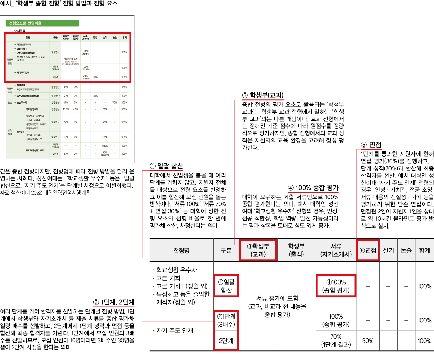 학생부 종합 전형은 교과 성적, 논술 성적, 수능 점수처럼 단일한 평가 정보를 활용하지 않는다. 대신 학생부와 자기소개서 등의 전형 요소를 활용해 지원자가 고교 3년간 학교생활 안에서 어떻게 성장했는지를 대학별 평가 항목에 맞춰 종합적이고 정성적으로 평가한다. 종합 전형을 제대로 이해하려면 ‘일괄 합산’ ‘단계별 전형’ ‘서류 100’ ‘서류 + 면접’ 등 전형 방법과 전형 요소의 개념부터 알아야 한다. 주요 대학의 2022학년 대학입학전형시행계획을 토대로 대학의 전형 방법과 각 전형 요소의 의미를 정리했다.