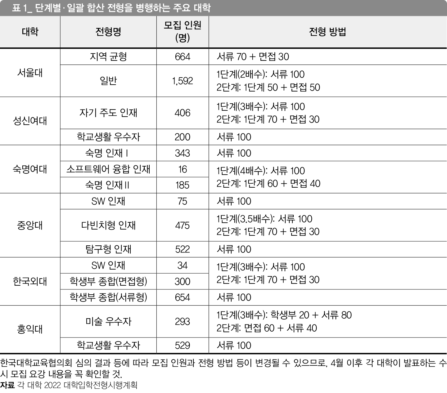 학생부 종합 전형은 단계별 전형으로 선발하는 경우가 많다. 서류 평가로 1단계에서 일정 배수의 인원을 선발하고 2단계에서 면접을 실시해 1단계 성적과 합산해 선발하는 단계별 전형이 일반적이다. 하지만 일부 대학의 경우 면접 없이 ‘서류 100%’ 또는 일괄 합산 전형의 방법을 취하기도 한다. 한 대학 안에서도 세부 전형 방법에 따라 단계별과 일괄 합산 전형을 병행하는 곳도 있다(표 1).
