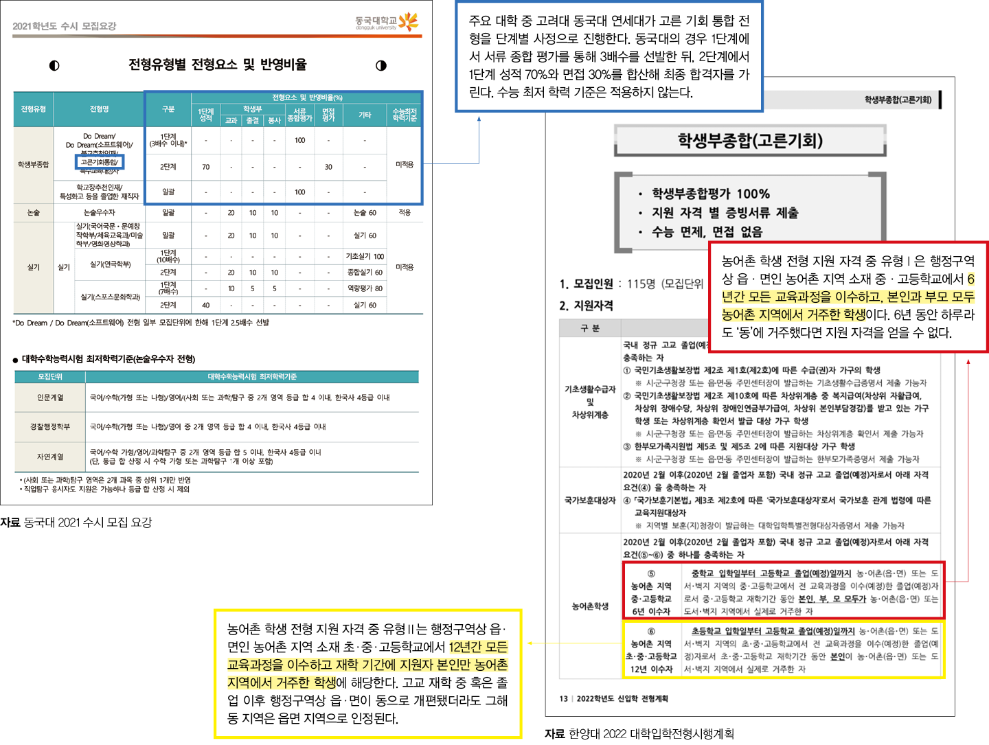 문 교사는 “정원 내 고른 기회 통합 전형 지원 자격에 농어촌 학생을 포함해 선발하는 경우가 대폭 늘었다. 따라서 고른 기회 전형의 지원 자격 기준을 확인하고, 현재 성적과 지원 희망 학과 등을 고려해 유불리를 따져봐야 한다”고 조언했다.