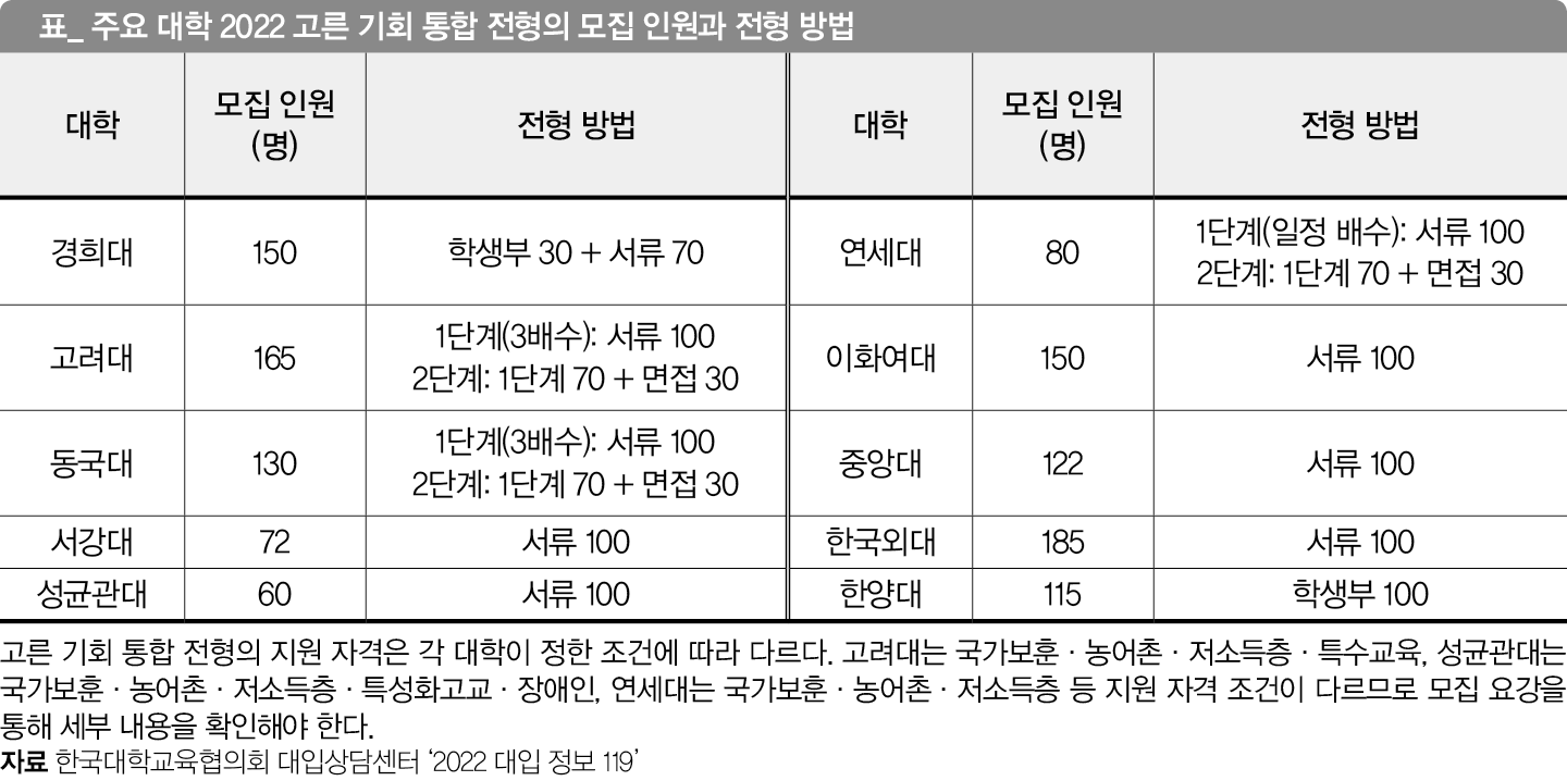 사회적으로 소외된 학생들을 배려하는 ‘고른 기회 전형’은 2021학년 대입부터 의무화됐다. 올해도 선발 비율이 증가해 정원 외 포함 총 5만3천546명을 뽑는다. 정원 내 혹은 정원 외로 선발하는데, 단일 자격을 두고 선발하거나 ‘고른 기회 통합 전형’처럼 여러 자격 기준을 묶어 뽑기도 한다. 고른 기회 통합 전형의 경우 학생부 종합 전형 안에서 선발하는 인원이 가장 많다.
