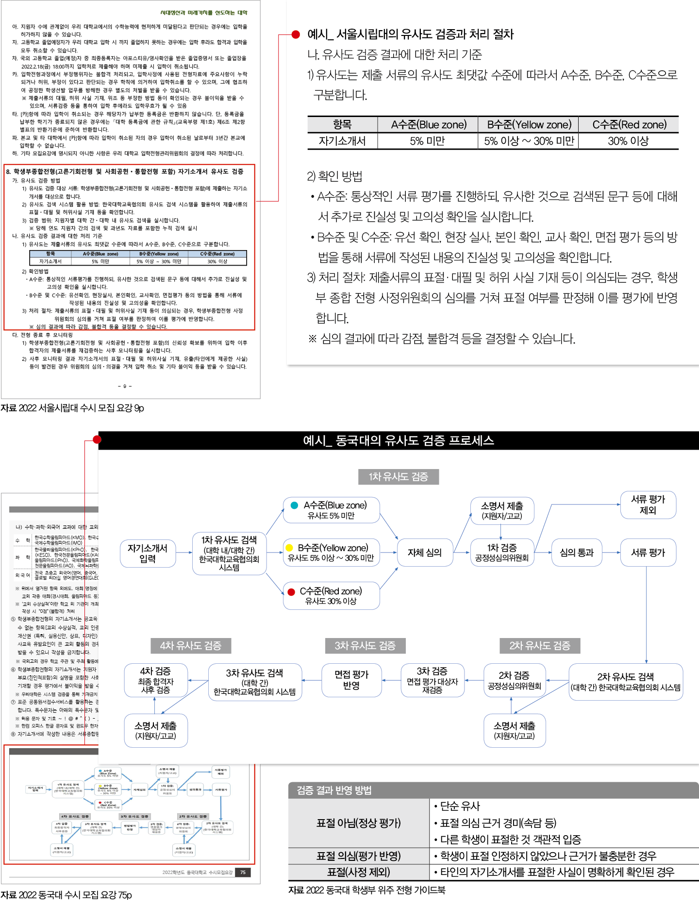 각 대학은 수시 모집 요강과 학생부 전형 가이드북 등에서 자기소개서 유사도 검증에 대해 안내하고 있다. 동국대 이재원 책임입학사정관은 “자기소개서 유사도 검증 과정에서 선의의 피해자가 발생하지 않도록 소명 자료 제출과 유선 확인, 현장 실사, 심층 면접, 고교 교사 확인 등 다양한 방법으로 서류 내용의 진위와 고의성 여부를 거듭 확인한다. 입시가 끝난 후에도 지원 서류를 다시 검증하는데, 사후 검증 결과 표절이 발견되면 입학 이후라도 입학을 취소할 수 있다”고 설명했다.