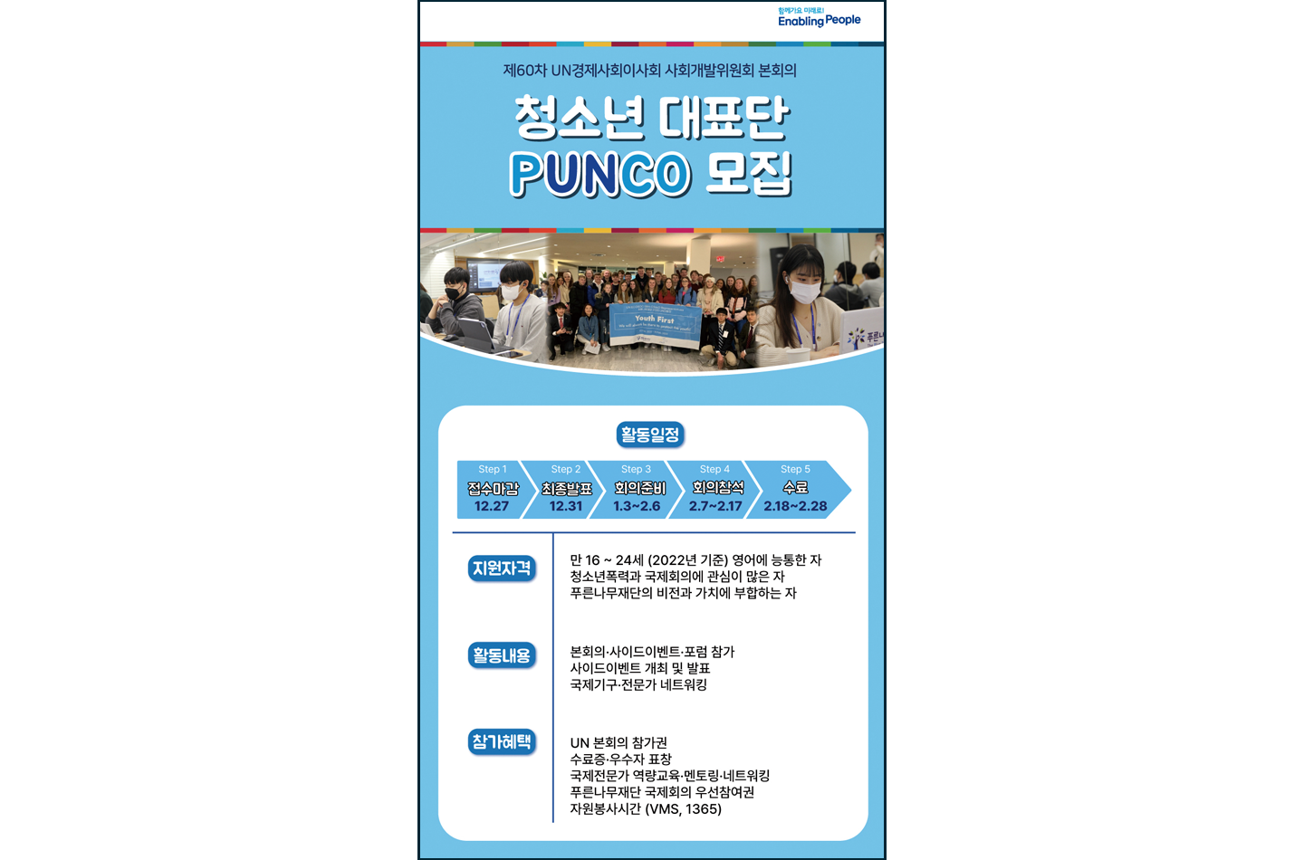 푸른나무재단이 내년 2월 열리는 제60차 UN경제사회이사회 사회개발위원회 본회의에 참여할 청소년 대표단 PUNCO(푸앤코)를 모집한다. UN 청소년 대표단은 본회의에서 성명문 제출, 사이드 이벤트(세미나) 개최 등을 통해 청소년 사이버폭력의 심각성을 국제사회에 알리고, 국제 NGO와 협력해 비폭력 문화를 확산하는 활동을 펼친다.