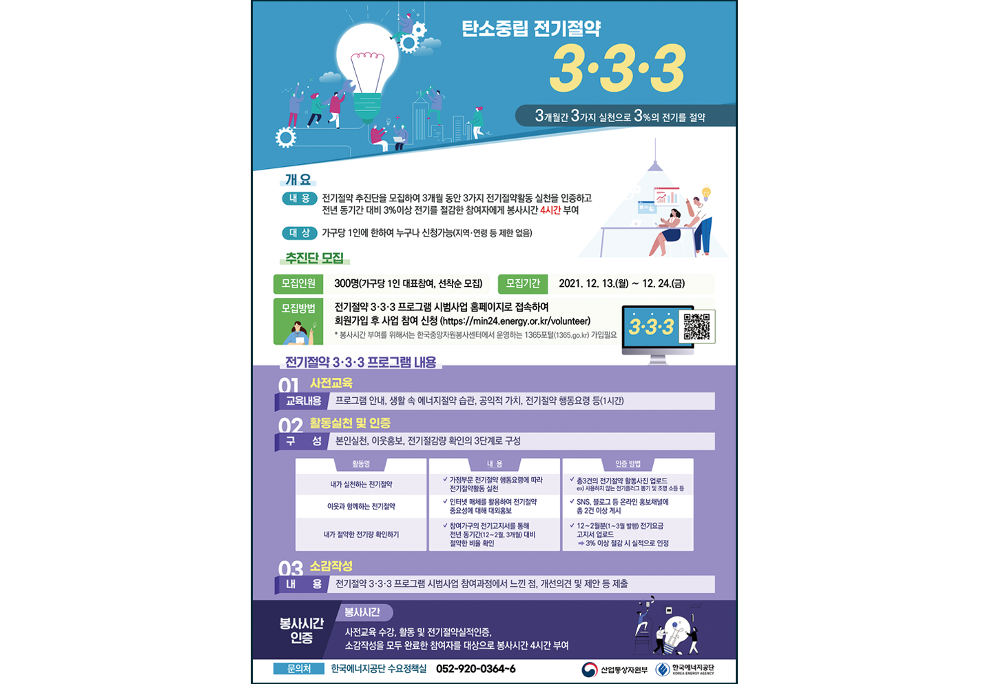 한국에너지공단은 지속적인 에너지 절약과 탄소중립에 기여하고자 ‘전기절약 3·3·3 프로그램’을 실시한다. 참여자를 모집해 3개월 동안 3가지 전기 절약 활동 실천을 인증하고, 전년 동기간 대비 3% 이상 전기를 절감하면 봉사 시간을 부여하는 프로그램이다.