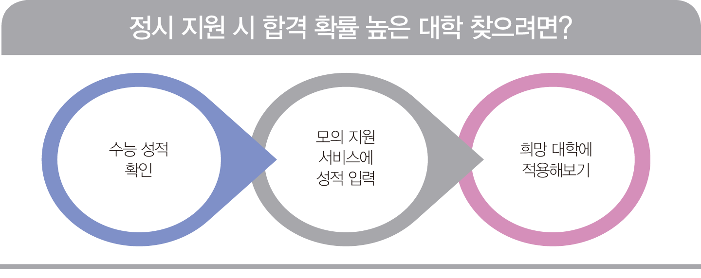 수능 성적을 받은 후 무료 프로그램인 서울시교육청의 쎈진학, 유료인 진학사, 유웨이 등의 모의 지원 서비스에 자신의 성적을 입력해두고 관심 있는 몇 군데 대학을 지원하면 합격 확률이 얼마나 높은지 알려줍니다. 모의 지원 서비스의 경우 처음 학생들의 점수 표본이 많이 입력되지 않은 시점에는 합격 확률이 높은 것으로 나오다가 점점 많은 학생들이 지원하면서 합격 확률이 떨어지기도 하니 주의하기 바랍니다. 정시 원서를 쓸 무렵, 즉 학생들의 점수 표본이 많이 들어온 시점이 더 정확합니다.