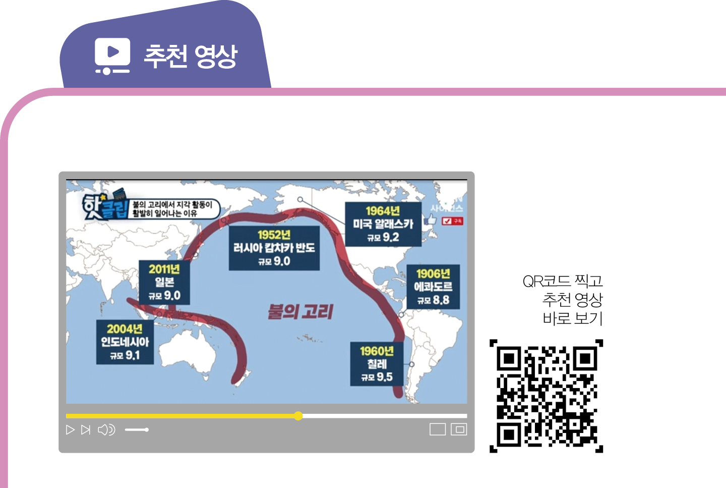 화산이 밀집된 환태평양 조산대인 불의 고리는 전 세계 활화산의 70%인 450여 개가 모여 있는 태평양의 용광로다. 지구 내부에는 평균 두께 100km의 거대한 암석판들이 존재하는데, 화산과 지진은 크고 이동속도가 빠른 지각판이 서로 충돌하거나 벌어지면서 발생하는 에너지의 분출이다. 궁금하면 클릭~
