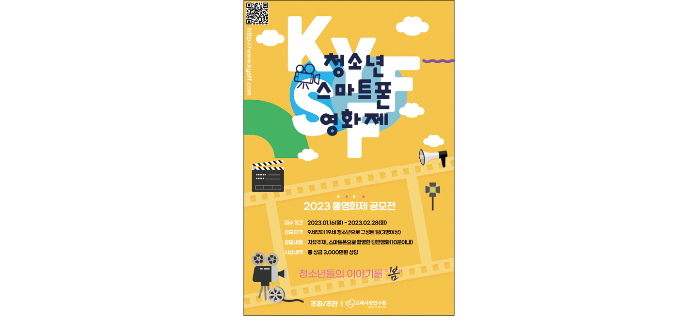 교육사랑연수원은 청소년들이 스마트폰으로 촬영한 단편영화를 출품하는 2023 봄영화제 공모전을 개최한다. 주제는 자유이며 스마트폰과 태블릿으로 촬영한 10분 미만의 엔딩 크레딧이 포함된 영상이어야 한다. 9세 이상의 청소년 3명 이상이 팀을 구성해 작업하고 초등부·중등부·고등부별로 2월 28일까지 제출하면 된다.
