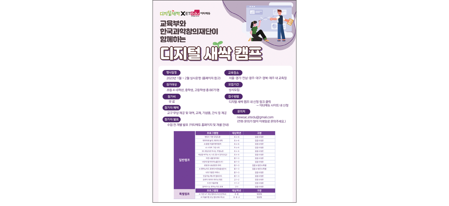 교육부와 17개 시·도 교육청, 한국과학창의재단은 학생들이 겨울방학과 봄방학 동안 소프트웨어와 인공지능을 접할 수 있도록 디지털 새싹 캠프를 개최한다. 특히 2023년부터 고교학점제가 단계적으로 적용될 예정이라 초·중·고등학교에 걸쳐 정보 교육이 점차 강화되는 만큼 다양한 디지털 교육과 체험의 기회를 제공하고자 한다.