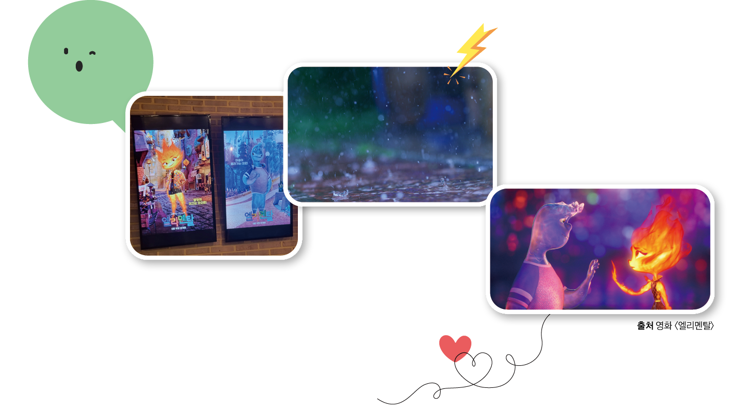 오랜만에 딸의 손을 잡고 영화관에 갔어요. 사춘기 소녀의 픽은 감동의 픽사 애니메이션 <엘리멘탈>. 불처럼 열정 넘치는 ‘앰버’와 물처럼 투명하고 감성적인 ‘웨이드’가 만나 세상의 벽을 깨고 자신 안의 새로운 가능성을 발견하는 이야기였는데요. 한국인이라면 공감할 수밖에 없는 K장녀의 성장 스토리에 두 모녀의 눈물샘도 함께 터졌습니다.