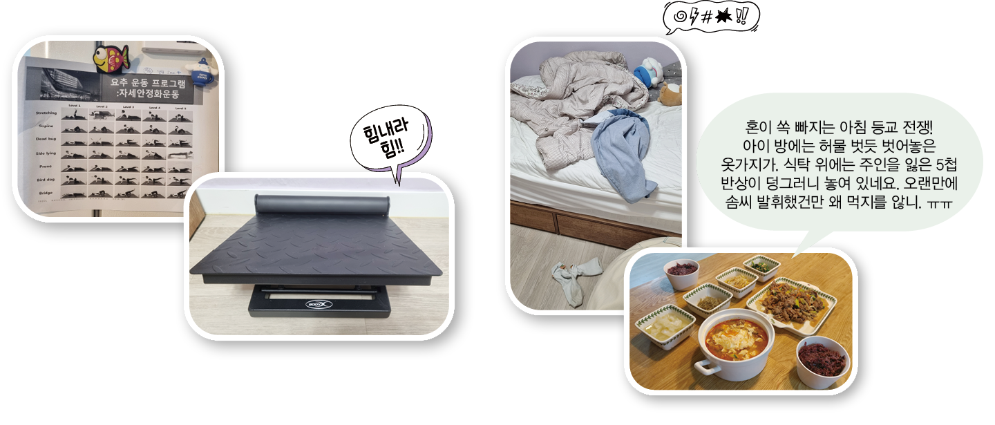 바쁜 아침에 이어 오후에는 빗길에 병원행. 평소에 요상한 자세로 공부도 하고 폰도 하고 게임도 하더니만 결국 탈이 났습니다. 요족에 거북목에 골반 불균형까지 삼관왕 달성. ㅠㅠ 공부는 체력 싸움이라는데 벌써부터 큰일이네요. 엄마 속은 타들어가는데 운동을 해야 할 당사자는 천하태평입니다. 대학병원에서 받아온 운동처방전을 냉장고 옆에 탁 붙여놨는데도 보는 둥 마는 둥, 가만히 서 있기만 해도 스트레칭 효과가 있다는 운동기구 역시 찬밥 신세네요. 결국 엄마의 잔소리를 한바가지 들은 뒤에야 마지못해 운동기구 위에 오릅니다.