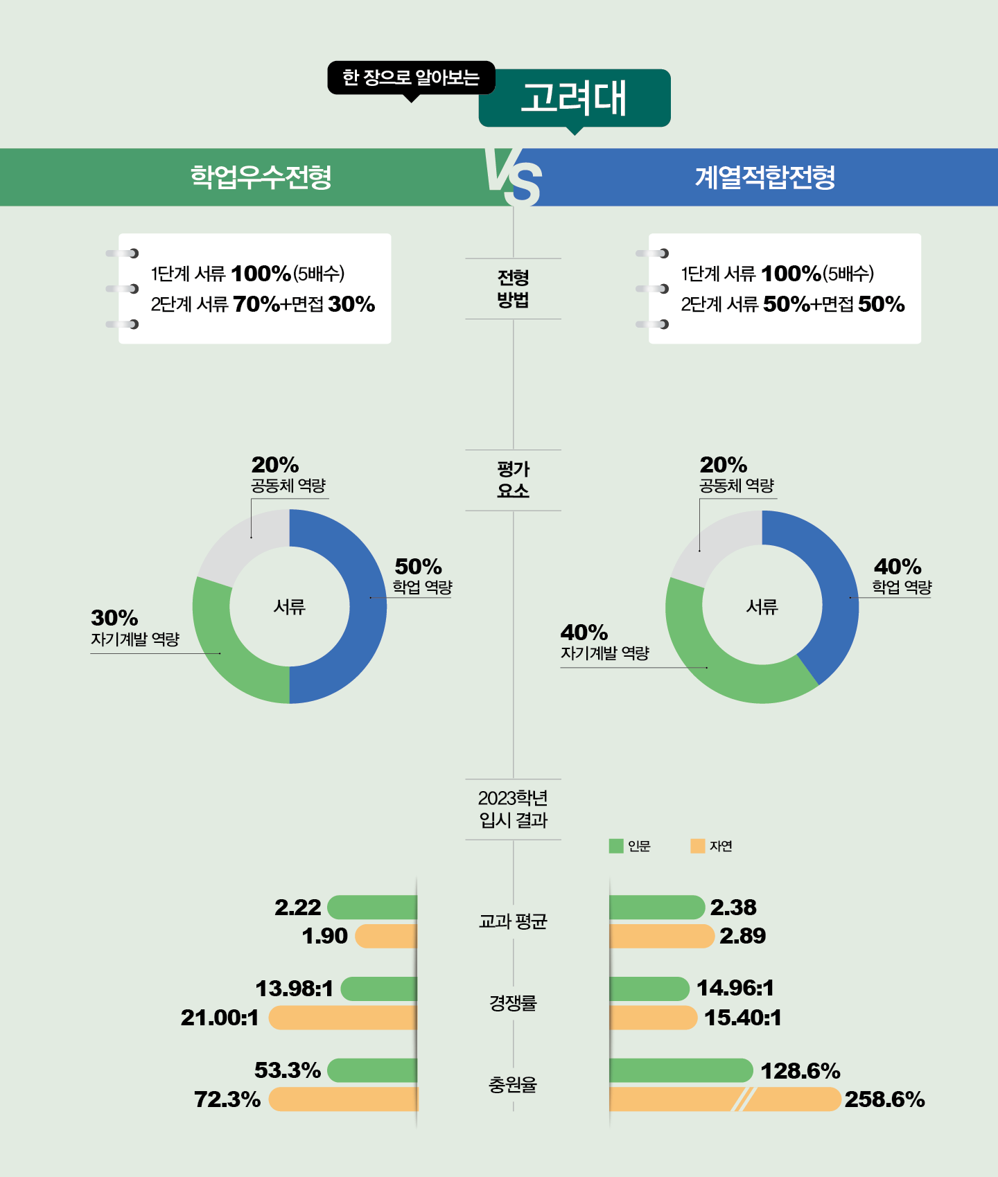 학업우수전형은 학업 역량 50%, 자기계발 역량 30%, 공동체 역량 20%를 반영하고, 계열적합전형은 학업 역량과 자기계발 역량을 각각 40%씩, 공동체 역량 20% 반영한다. 고려대 최미정 책임입학사정관은 “교과 성적이 우수한 학생은 학업우수전형이, 지원 모집 단위와 관련된 활동을 많이 했다면 계열적합전형이 유리하다. 계열적합전형에서 인문 계열은 모집 단위의 성격에 적합한 면접을 진행하기 위해 인문과 사회로 분리해 실시한다”고 설명했다.