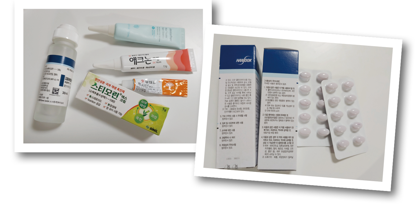 “여드름이 이마에 조금씩 날 때는 크게 신경을 안 썼어요. 한두 달 사이 빼곡하게 이마를 채운 여드름을 보고, 놀란 마음에 병원으로 달려갔죠. 주사도 맞고 압출도 하고 피부 관리까지 여드름 패키지로 정성을 쏟았지만, 효과는 미미했어요. 학년이 올라갈수록 주 1회 관리도 부담스러워져 제가 집에서 해줬어요. 압출 전용 도구를 소독해 짜고, 약국에서 파는 분말 상처 치료제를 톡톡 발라줬어요. 압출한 부위에 2~3일간 항생제 연고를 바르고, 진정되면 새살 연고로 마무리해줬어요.”
