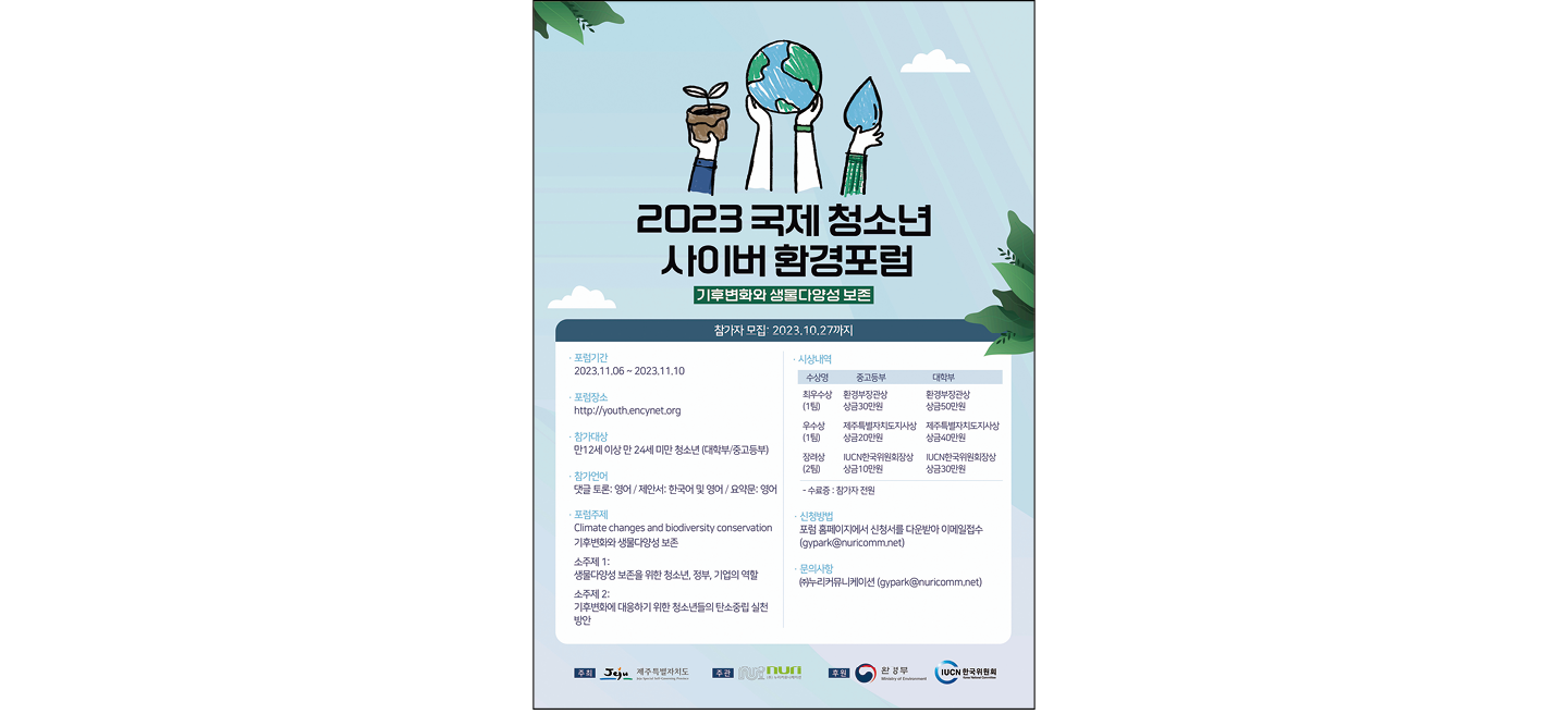 날이 갈수록 심각해지고 있는 기후변화 문제와 환경 보전을 위한 청소년들의 역할에 대해 사이버상에서 이야기할 수 있는 토론의 장이 열린다. 국내외 청소년을 대상으로 하는 ‘2023 국제 청소년 사이버 환경포럼’은 영어로 다양한 주제를 발표해 환경 관련 정보를 공유하고 당면한 여러 환경 문제에 대한 해결 능력의 기회를 제공한다.
