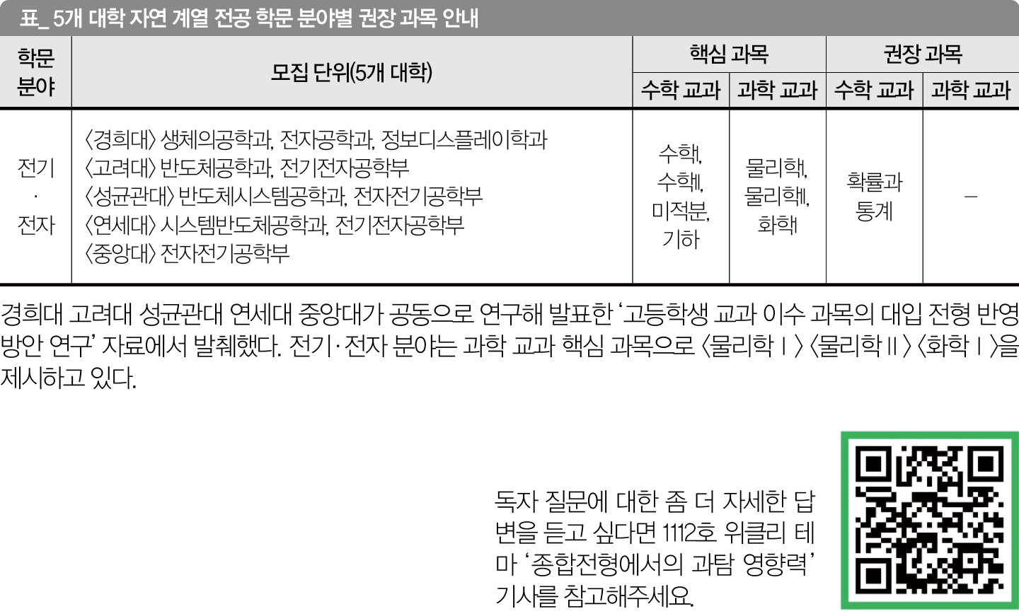 카이스트 전기전자공학부 이현주 교수는 “전기전자공학부의 교육과정은 수학, 물리 역량을 더 많이 요구하지만 세부 전공에 따라 조금씩 다르다. 예를 들어 반도체 공정 분야는 재료를 다루기 때문에 화학이 필요하다”라고 설명합니다. 서울 배재고 장지환 교사는 “종합전형을 고려하는 최상위권은 대학들의 과목 연계 이수 권고를 참고해 선택하되 깊이를 더하고, 중·상위권 학생들은 과학 과목을 회피하지 말고 최대한 이수하길 권한다”고 조언합니다.