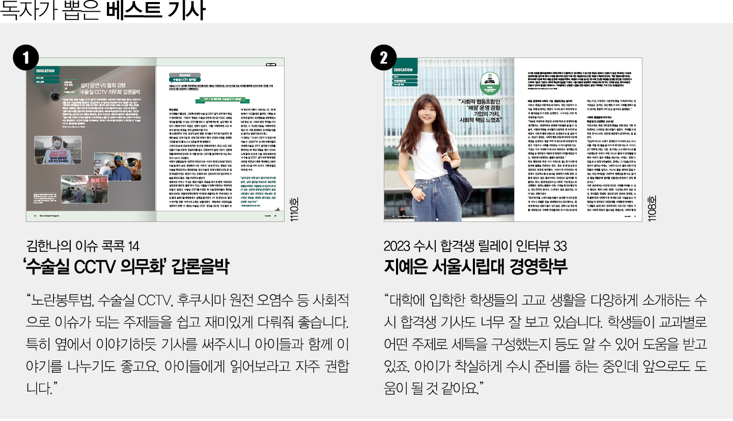 아이가 고1, 중2예요. 한창 대입이나 고입에 관심을 가져야 할 때죠. 거기다 제가 목사라서 청소년들을 만날 일이 많아요. 그 친구들에게 학습을 비롯해 여러 이야기를 해줄 때가 있는데 <내일교육>을 읽으며 도움을 받고 있어요. 대입 관련 기사도 잘 읽지만 시사 이슈나 진로 인터뷰 등 다양한 교육 기사들도 잘 활용하고 있습니다.