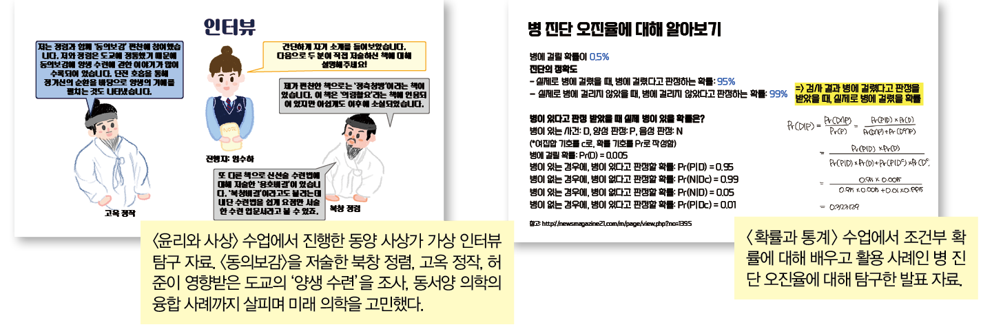 <언어와 매체> ‘언어의 특성과 국어의 위상’ 중 언어와 사회의 관계를 학습하며 사회 방언인 의학 용어를 착안해 ‘환자와 의료진의 의사소통을 위한 의학 용어’를 탐구, 보고서로 작성 <확률과 통계> 조건부 확률을 활용한 병 진단 오진율을 탐구, 오진에 의한 피해 구제와 의료 분쟁, 예방 대책에 대해 조사·발표 <생활과 윤리> 생명 윤리와 관련해 조력 존엄사 법안의 발의를 알아보고 찬반 입장을 탐구