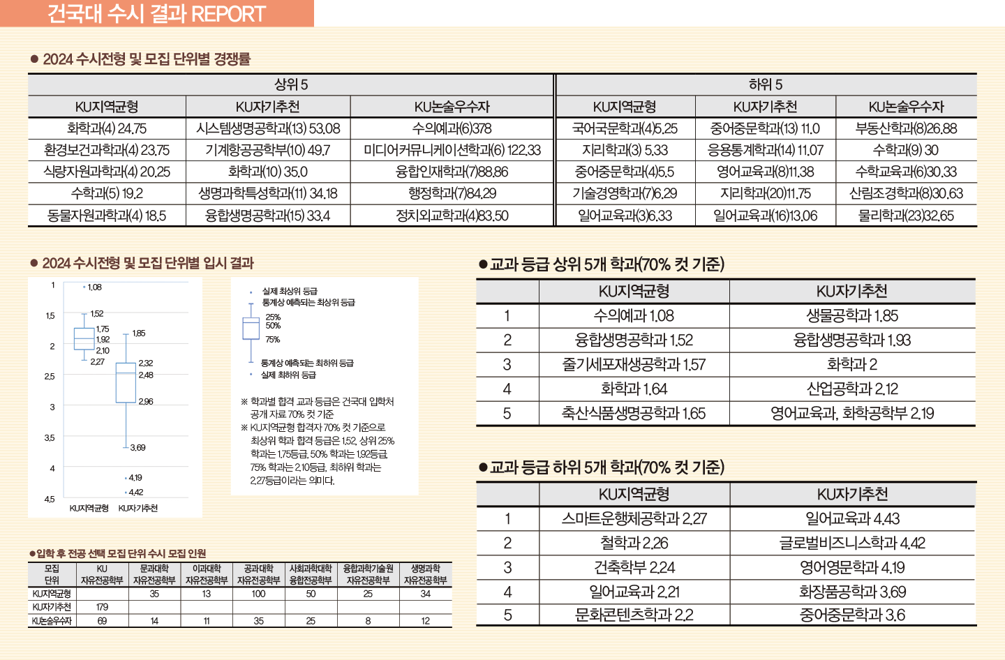 2024학년에 자기소개서가 전면 폐지됨에 따라 학생 개인의 경험을 스스로 평가한 내용을 알 수 없어 아쉬움은 있었지만, 교과 학습 발달 상황(세부 능력 및 특기 사항) 및 창의적 체험 활동 등에서 학생의 탐구 내용과 역량을 찾아 평가하는 기조는 동일했다. KU지역균형은 2023학년에 교과 정성 평가를 도입해 유지 중이다. 지원자의 내신 등급은 1등급대 초반에서 2등급대 중·후반까지 분포했으며, 등록자의 99%가 일반고 학생이다.