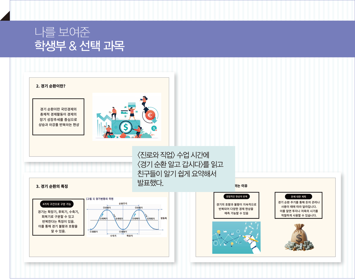<영어독해와 작문> 영어로 인플레이션과 디플레이션에 대해 설명함. 인공지능이 경제 관련 직업을 얼마나 대체할지 조사함 <정치와 법> 정치 혼란과 투자 감소, 선거와 물가 상승, 경제 침체와 정권 교체 등의 사례를 들어 정치와 경제의 상관관계를 논리적으로 전개함