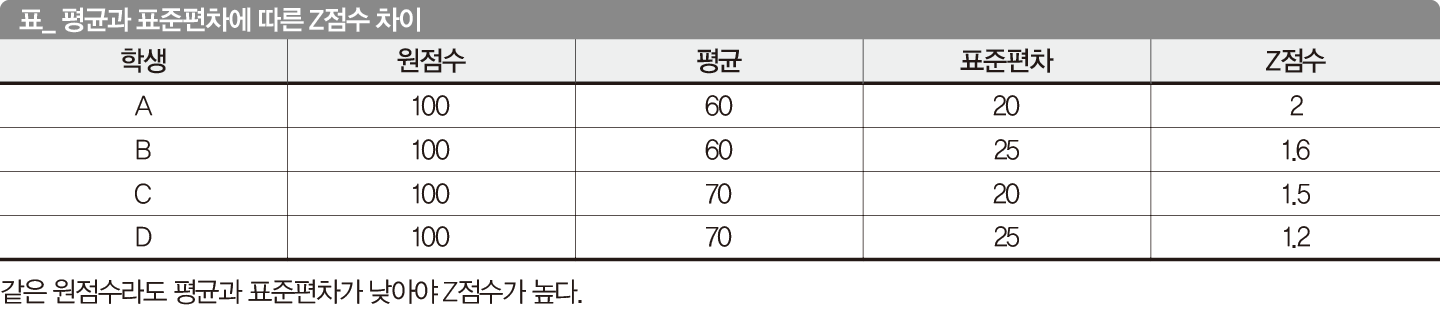 원점수는 높고 평균은 낮으며 표준편차가 작을 때 높은 Z점수를 얻을 수 있습니다. 즉 어려운 시험(낮은 평균)에서 나만 잘 본 경우(높은 원점수)이면서, 같은 시험을 본 학생의 학업 역량이 비슷해 성적 차가 크지 않은 경우(낮은 표준편차) 유리합니다(표).