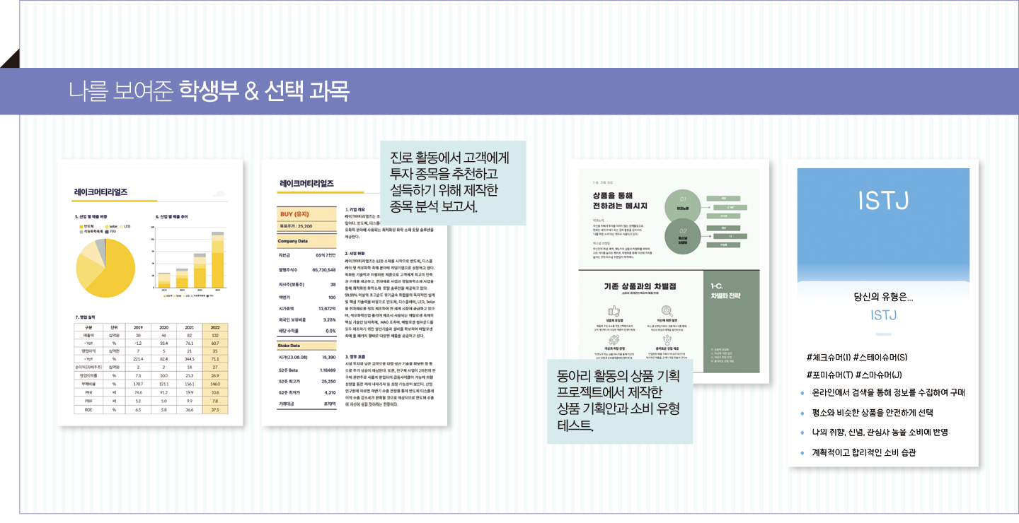 “스태그플레이션을 일으킬 수 있는 3고 현상의 대응 방안을 모색하기 위해선 방대한 자료를 조사해야 했어요. 국가 간 경제 상황을 비교 분석해 앞으로의 영향을 예측하고, 도표와 그래프까지 제작하는 과정에서 ‘함께’의 힘을 실감했죠. 모둠 활동이 개인 활동에 비해 자신을 드러내지 못한다고 생각하기 쉽지만 전혀 그렇지 않아요. 오히려 굳이 설명하지 않아도 강점을 드러낼 수 있죠. 내가 팀에서 기획 파트를 맡았다는 것만으로도 이미 뛰어난 기획 능력이 있음을 증명하는 것 아닐까요?”
