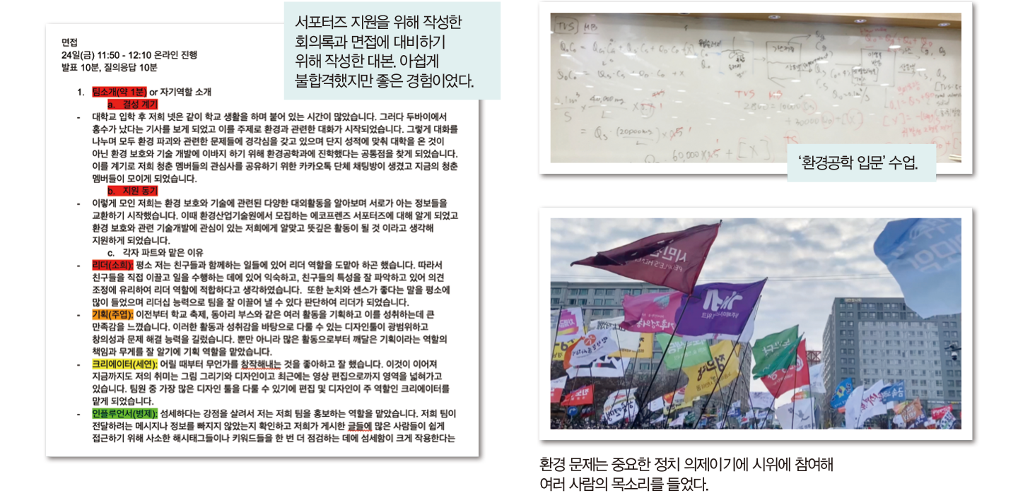 예전부터 정치에 관심이 많았기에 여러 시위에 참여하며 목소리를 내보기도 했다. 현장에서 직접 듣는 여러 사람의 의견은 전공과도 맞닿아 있었다. 이들이 토로하는 환경 문제를 접하면서 환경공학도로서 앞으로 어떤 일을 해야 할지 고민이 깊어졌다. 이론으로 배우는 지식이 실제로 현장에서 어떻게 적용되는지, 현장에 어떤 어려움이 있는지 알 수 있었다.