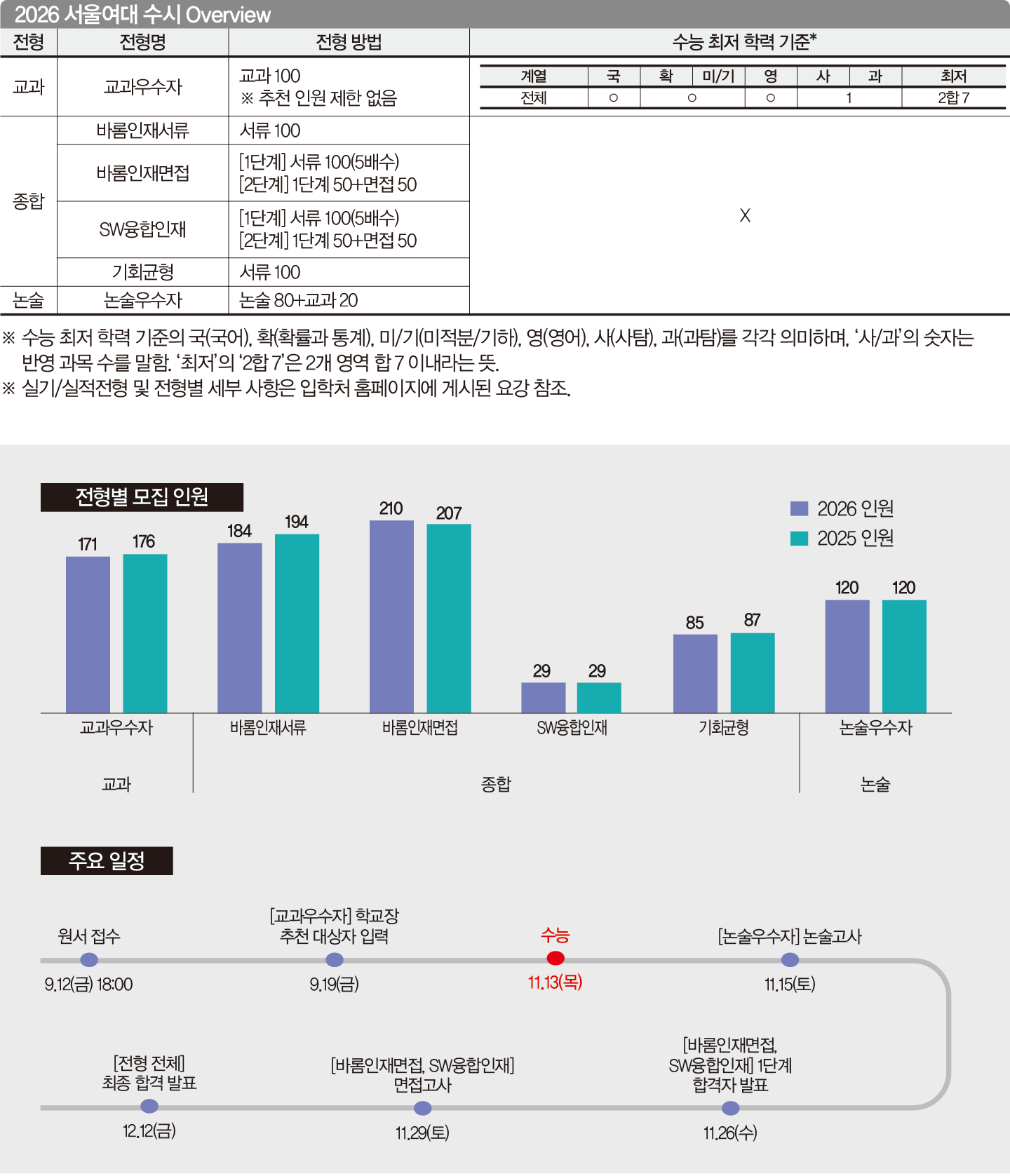 서울여대는 2026학년 논술전형의 변화가 크다. 자연 계열에서 진행했던 과학 논술을 수리 논술로 변경하고 수능 최저 학력 기준은 폐지했다. 수리 논술의 출제 범위는 <수학> <수학Ⅰ·Ⅱ>다. 또한 올해 논술전형은 자유전공학부 120명만 선발한다. 가장 선발 규모가 큰 바롬인재면접전형은 총 210명을 선발한다. 1단계에서 서류 100%로 5배수를 선발한 후 2단계에서 1단계 50%와 면접 50%를 합산하며, 면접고사는 수능 후에 진행한다. 바롬인재서류전형은 184명을 서류 100%로 선발한다. 교과우수자전형은 171명을 교과 100%로 선발하며, 전 모집 단위에서 2합 7 이내의 최저 기준을 반영한다. 2026 수시에서 눈여겨볼 점을 김해선 입학사정관실장에게 들었다.