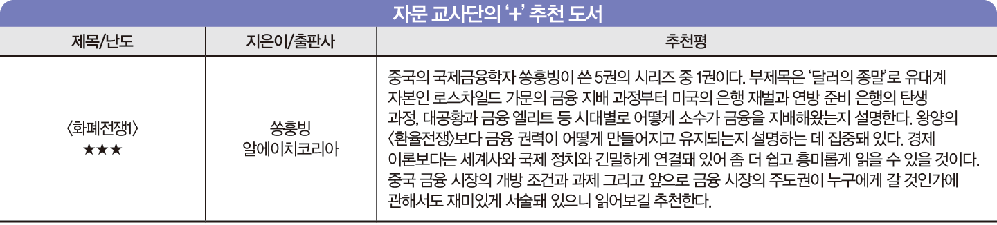 “중국 학자 왕양이 금융사적으로 화폐가 어떻게 시작됐고, 현재의 달러 중심 금융 체제가 어떤 과정으로 완성됐는지 소개한 책입니다. 최근 트럼프 2기 정부가 미국 우선주의 정책을 실시하면서 세계를 상대로 관세 ‘전쟁’을 벌이는 현재의 상황을 잘 설명해준다는 점에서 의미가 있죠. 특히 글쓴이가 중국인이어서 기존에 우리가 자주 접해온 미국 중심의 사고를 벗어나 중국 등 아시아의 금융 시장이 발전하지 못한 이유와 미국이 왜 관세를 부과해야만 하는지, 그 근본적인 원인을 찾을 수 있습니다. 환율은 복합적이고 예측이 어려운 분야지만, 가장 현실적이고 실제적인 경제 문제이기 때문에 잘 알아야 하는 개념입니다. 경제 분야에 관심 있는 학생에게 이 책을 추천합니다.”_ 자문 교사단