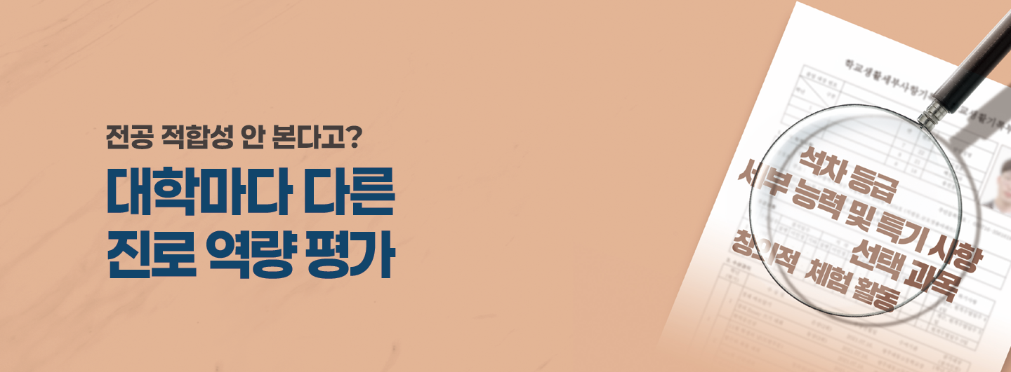 한데 최근 “우리는 전공 적합성을 안 봅니다”라고 이야기하는 대학들이 많아졌습니다. 서강대 성균관대 한양대 등이 대표적입니다. 실제 대학이 서류 평가에서 주요하게 보는 평가 요소 중 차이가 큰 부분이 진로 역량 관련 항목입니다. 건국대 경희대 중앙대 한국외대 등은 진로 역량으로, 고려대는 자기계발 역량, 동국대는 전공 적합성, 서강대는 성장 가능성, 서울시립대는 잠재 역량, 성균관대는 탐구 역량 등의 이름으로 평가합니다. 대학 내에서도 모집 단위에 따라 진로 역량 또는 성장 역량으로 다르게 평가하기도 합니다. 학생부에서 진로 역량을 평가하는 대학의 관점을 들여다봅니다.