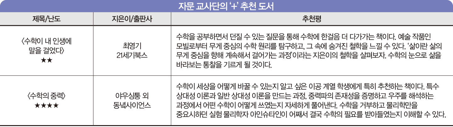 “수학은 수와 양, 그리고 공간의 성질에 관해 연구하는 학문입니다. 그렇다면 수와 양, 공간에 관심이 없는 사람들은 이 과목을 왜 공부해야 할까요? 이 책은 수학을 인간과 관련된 모든 것을 연구하는 학문이라는 ‘인문학’의 관점에서 바라보고 해석합니다. 우리가 수학을 공부해야 하는 이유를 시작으로, 음악 경제 영화 건축 동양고전 역사 미술 속에서 수학 개념이 얼마나 잘 연결되는지 설명해줍니다. 주변 곳곳에 숨어 있는 수학을 살펴보고 탐구자의 시선에서 세상을 바라볼 수 있게 도와주는 책이에요.”_ 자문 교사단