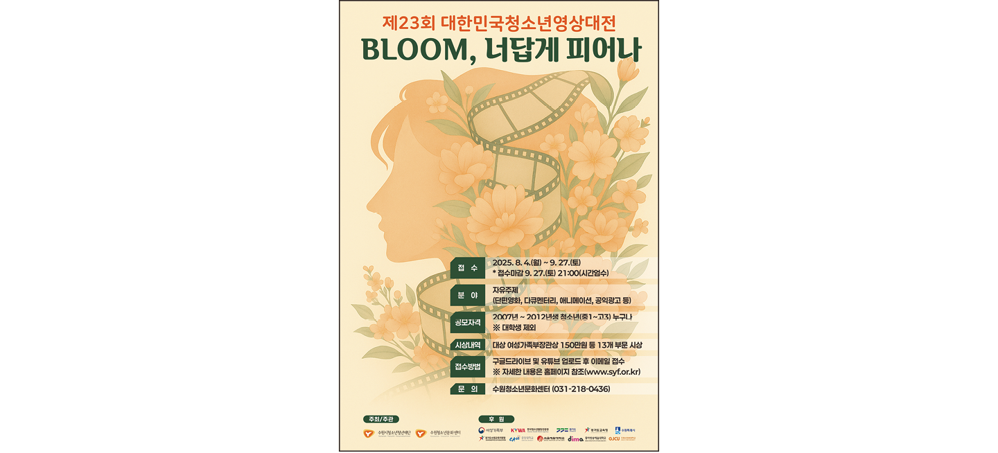 ‘BLOOM, 너답게 피어나’라는 주제로 청소년들의 참신하고 창의적인 아이디어를 담은 창작 영상물을 공모한다. 단편 영화, 다큐멘터리, 애니메이션, 공익 광고, 뉴미디어 등 영상 분야에 제한은 없다. 구글 드라이브 및 유튜브에 영상을 업로드한 후 신청서와 영상 링크를 이메일(kyfasuwon@gmail.com)로 접수하면 된다. 수상자에게는 상금 150만 원을 수여한다.
