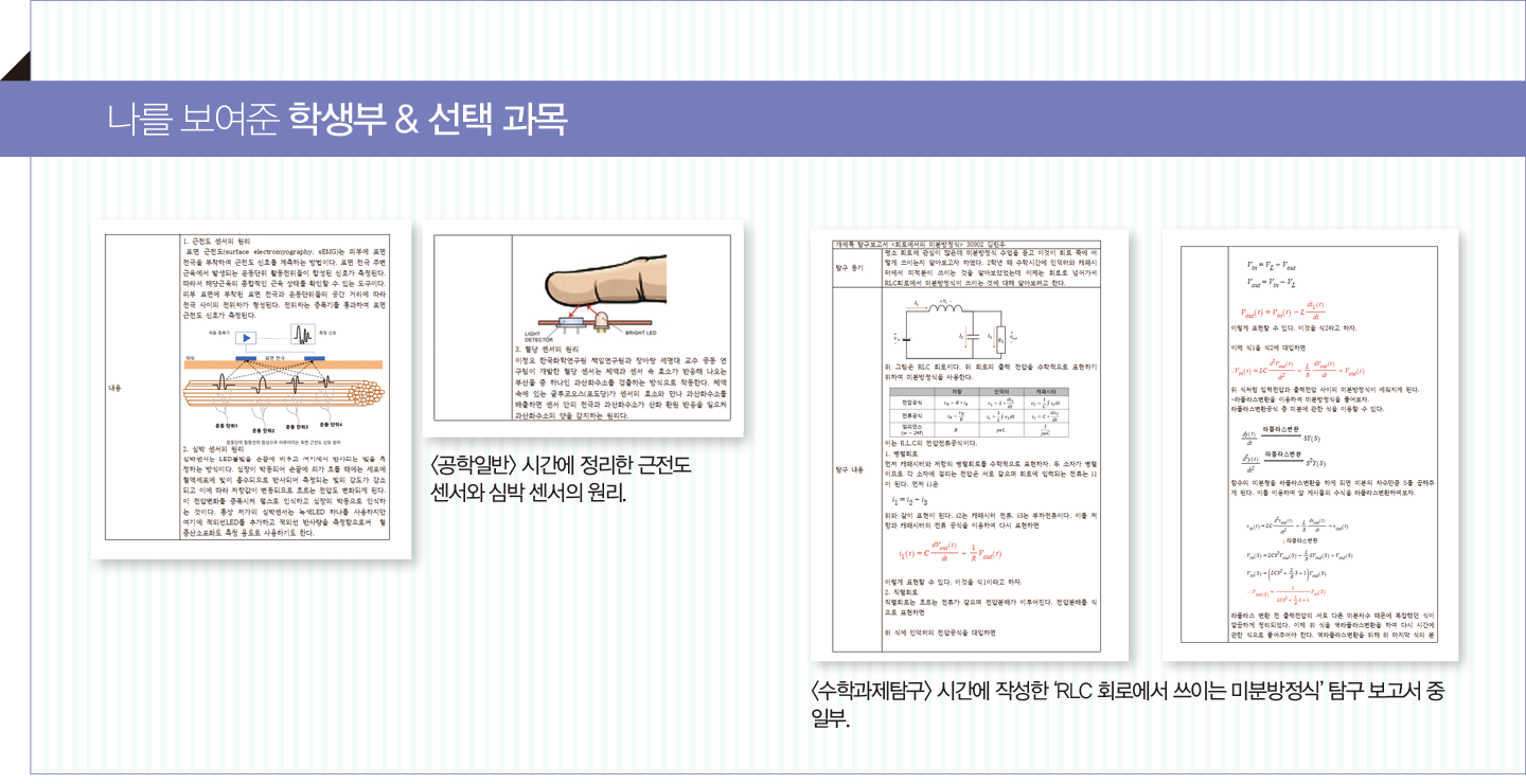 ▒ <물리학Ⅰ·Ⅱ> <화학Ⅰ·Ⅱ> 공학 전공을 희망한다면 필수로 이수해야 할 과목이다. 수학을 활용하는 단원이 많아 즐겁게 공부했다. <화학Ⅱ> 시간엔 액정 디스플레이의 내부 구조와 빛의 투과 원리를 발표했고, 실제로 시계 액정 디스플레이의 편광필름을 회전시키며 설명해 청중의 호응을 얻었다.