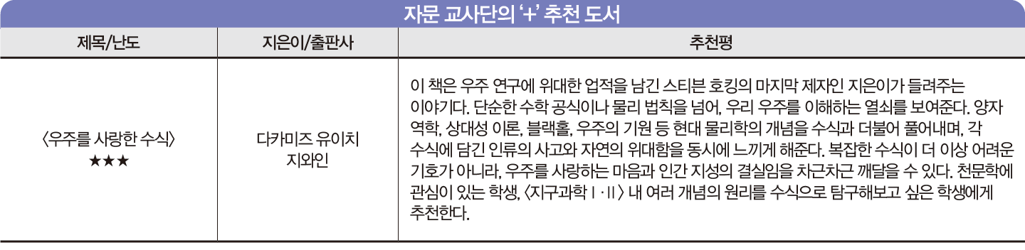 책장을 덮고 나면 <지구과학Ⅰ·Ⅱ>에서 배운 내용이 단순한 공식이 아니라 삶과 우주를 잇는 열쇠로 느껴질 것이다. 그냥 올려다봤던 밤하늘도 수억 광년의 거리를 건너온 메시지처럼 다가올지도 모른다. 지구의 하루 길이가 변해온 이유, 별자리와 계절의 관계, 빛이 건너온 거리를 헤아리는 법은 이제 시험 문제가 아니라 내가 사는 세상을 새롭게 바라보게 만드는 질문이다. 갈 수 없지만 알 수 있다. 이 문장이야말로 지금 청소년에게 가장 매력적인 우주의 초대장이 아닐까.