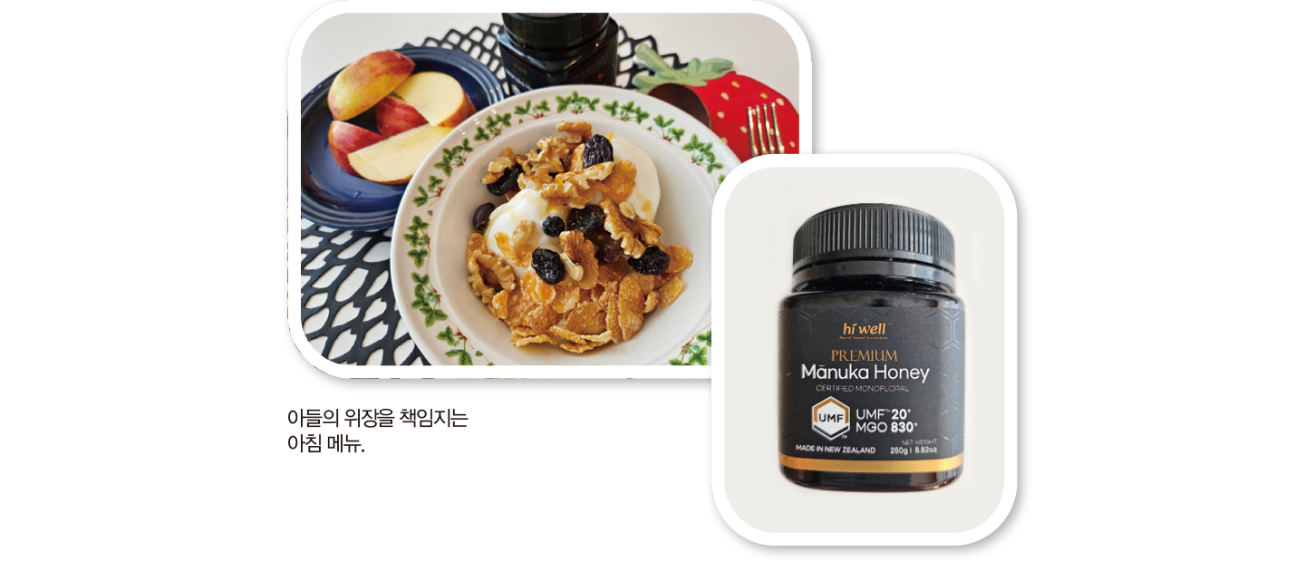 어릴 때부터 아들이 변비가 심했는데 중학교에 입학하면서 증상이 더 심해졌어요. 일찍 집을 나서야 해서 화장실을 못 가다 보니 학교에서 종일 더부룩한 채로 지내다가 옵니다. 그러다가 우연히 아침에 떠먹는 요구르트에 견과류와 시리얼, 마누카 꿀을 뿌려서 먹기 시작했는데 효과가 너무 좋아요.
