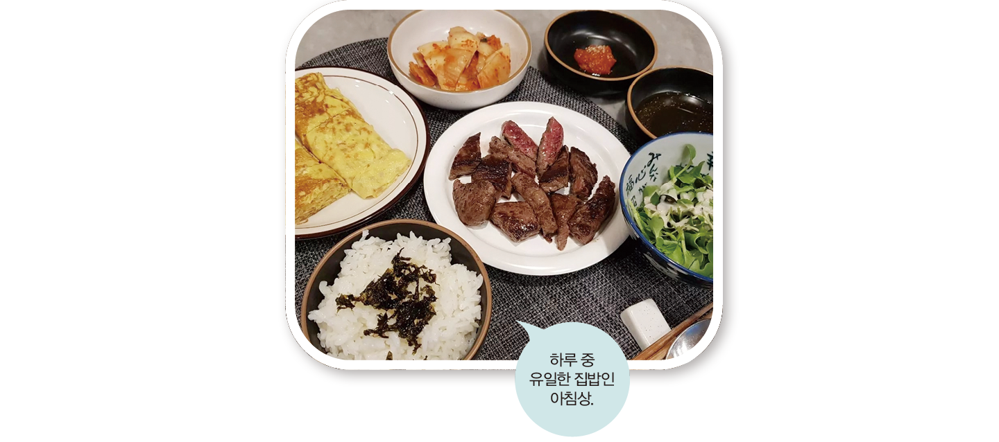 때문에 아침부터 고기를 굽는 날도 종종 있답니다. 그나마 고기 굽는 날은 식탁이 소박한 편이에요. 학교에서 돌아온 아들이 “엄마, 아침에 고기 먹고 왔다니까 애들이 놀라~” 하고 말하니, 옆에 있던 남편이 한마디 보탭니다. “근데 이런 푸짐한 아침상의 유통기한은 1년인가?”