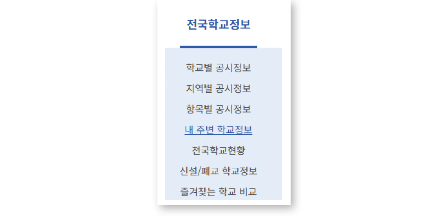 상단 메뉴바에서 ‘전국학교정보’를 찾아 커서를 올리면 하위 메뉴를 확인할 수 있다. 이 중 ‘내 주변 학교정보’를 클릭한다.