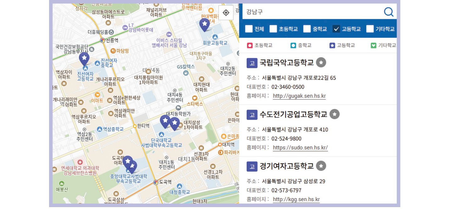 거주 지역 혹은 관심 지역을 검색창에 입력하면 인근 학교의 위치와 이름, 주소 및 홈페이지를 보여준다. 고교 선택에 활용할 경우 검색창 아래에서 ‘전체’가 아닌 ‘고등학교’에만 체크 표시를 누르면 고등학교만 표시할 수 있다. 특정 학교가 궁금하다면 학교명을 곧바로 검색해도 된다.