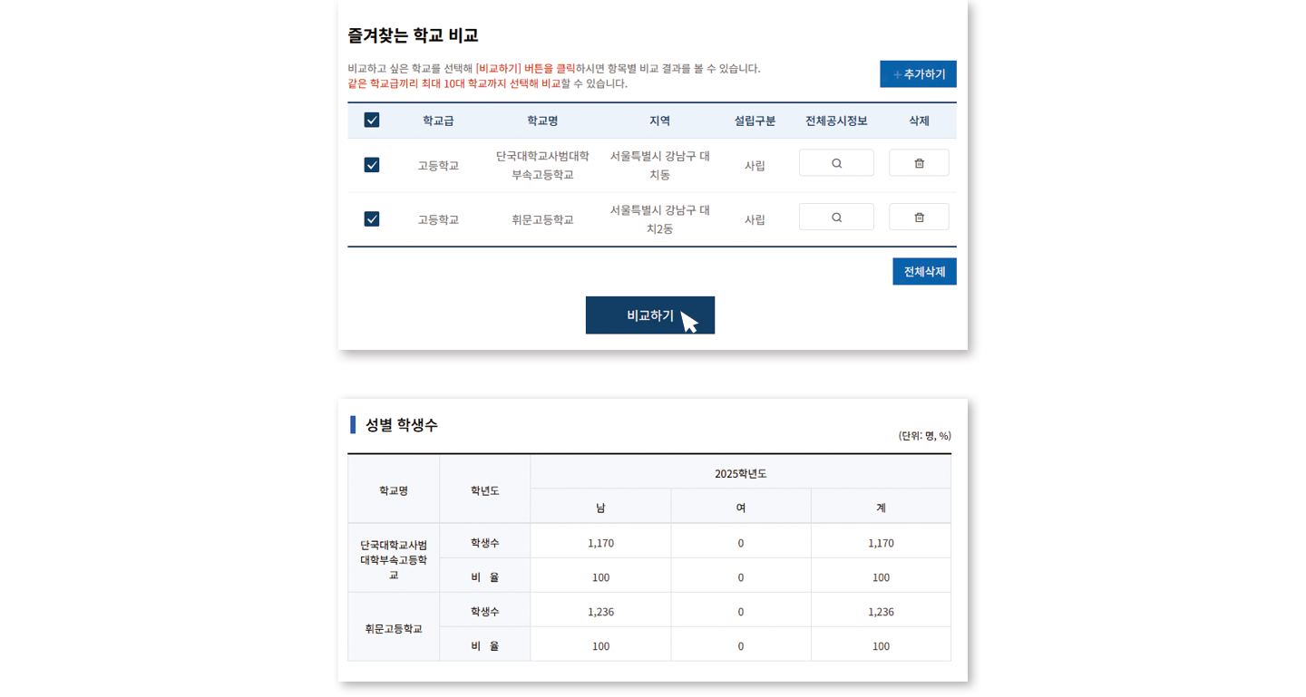 관심 있는 학교를 추렸다면 ‘전국학교정보’의 ‘즐겨찾는 학교 비교’ 기능을 유용하게 사용할 수 있다. 우측 상단의 ‘추가하기’ 버튼을 통해 즐겨찾는 학교를 2개 이상 추가한 뒤 ‘비교하기’ 버튼을 누르면 ‘성별 학생수’ ‘수업일수 및 수업시수 현황’ ‘입학생 현황’ ‘동아리 활동 현황’ ‘교육운영 특색사업 계획’ 등 다양한 요소를 비교한 표를 쉽게 확인할 수 있다.