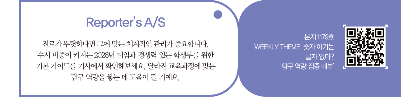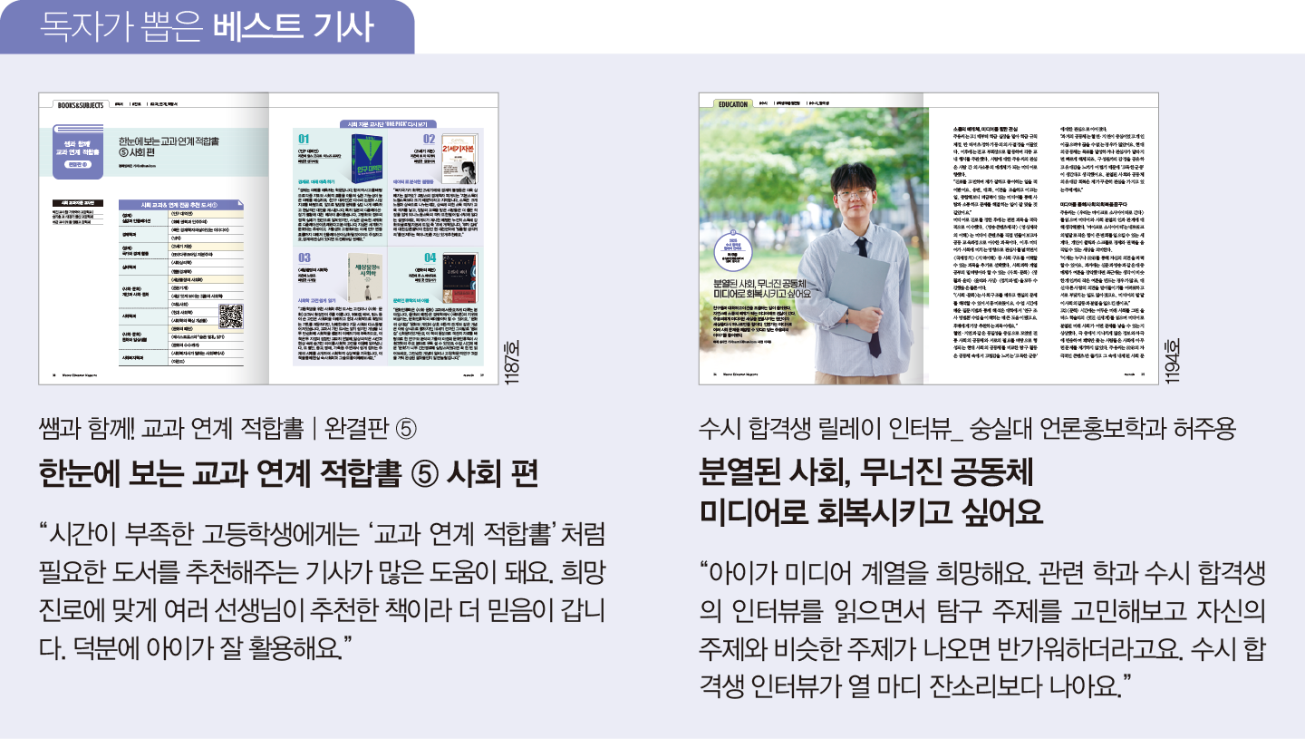 고등학생은 엄마와 대화를 나눌 시간이 별로 없거든요. 그나마 아침 식사 시간이 여유로워서 식탁에 잡지를 올려두면 아이가 밥을 먹으면서 관심 있는 부분을 찾아봐요. 신설 학교에 다녀서 선배가 없다 보니 내신이나 수행평가를 어떻게 접근하고 해결해야 할지 어려워하는데 이럴 때 ‘교과 연계 적합書’에서 추천하는 책이 도움이 돼요. 아이는 대학생 선배의 인터뷰를 보며 진로에 대한 힌트를 얻기도 한대요.